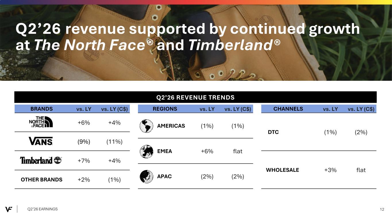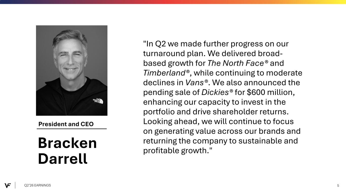 总裁兼首席执行官“在第二季度,我们的扭亏为盈计划取得了进一步进展。We delivered broad-based growth for the North Face®和Timberland®,同时继续缓和Vans的下滑®.我们还宣布了即将出售的Dickies®6亿美元,增强我们投资组合的能力,推动股东回报。展望未来,我们将继续专注于在我们的品牌中创造价值,并使公司恢复可持续和盈利的增长。”26年第2季度收益5 Bracken Darrell