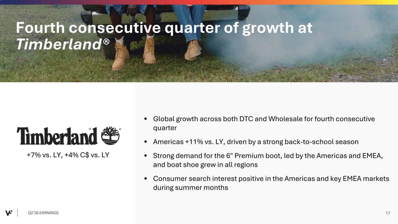 •全球DTC和批发业务连续第四个季度增长•美洲与LY相比增长11%,受强劲的返校季推动•在美洲和欧洲、中东和非洲地区的带动下,对6 " Premium靴子和船鞋的需求强劲,所有地区均有所增长•夏季月份美洲和欧洲、中东和非洲主要市场的消费者搜索兴趣积极+ 7%与LY相比,+ 4% C $与LY ' 26年第二季度收益17 Timberland连续第四个季度增长®