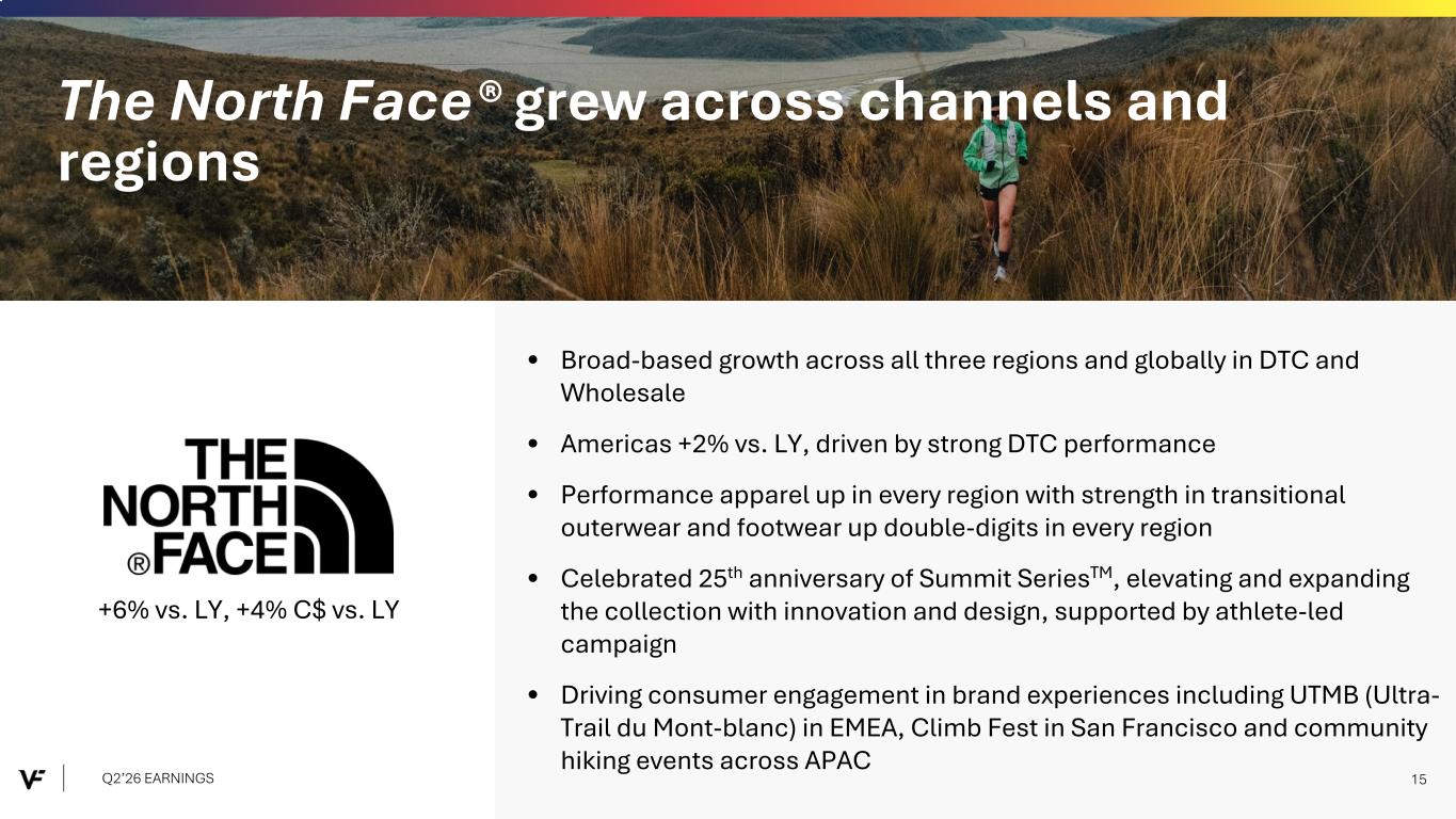 •在所有三个地区以及全球范围内,DTC和批发业务都实现了基础广泛的增长•美洲与LY相比增长2%,受强劲的DTC表现推动•每个地区的性能服装都有所上升,过渡外套和鞋类的实力在每个地区都增长了两位数•庆祝Summit SeriesTM 25周年,在运动员主导的活动的支持下,以创新和设计提升和扩展系列•推动消费者参与品牌体验,包括欧洲、中东和非洲地区的UTMB(Ultra-Trail du Mont-blanc)、旧金山的攀登节和亚太地区的社区徒步活动,与LY相比增长6%,+ 4% C $ vs. LY Q2’26 earnings 15 the North Face®跨渠道和跨地区增长