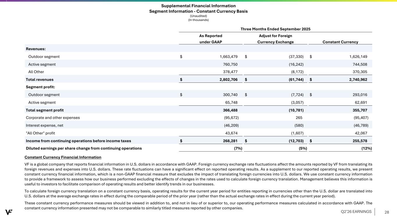 补充财务信息分部信息-不变货币基础(未经审计)(以千为单位)截至2025年9月的三个月按公认会计原则汇率下报告的外国调整不变货币收入:户外分部$ 1,663,479 $(37,330)$ 1,626,149活动分部760,750(16,242)744,508所有其他378,477(8,172)370,305总收入$ 2,802,706 $(61,744)$ 2,740,962分部利润:户外分部$ 300,740 $(7,724)$ 293,016活动分部65,748(3,057)62,691分部利润总额366,488(10,781)355,707公司及其他费用(95,672)265(95,407)利息净(46,209)(580)(46,789)“所有其他”利润43,674(1,607)42,067所得税前持续经营收入$ 268,281 $(12,703)$ 255,578来自持续经营业务的稀释每股收益变化(7%)(5%)(12%)不变货币财务信息VF是一家根据公认会计原则以美元报告财务信息的全球性公司。外币汇率波动影响VF报告的金额,将其国外收入和支出换算成美元。这些费率波动可能对报告的经营业绩产生重大影响。作为我们报告的经营业绩的补充,我们提供固定货币财务信息,这是一种非公认会计准则财务指标,不包括将外币换算成美元的影响。我们使用固定货币信息来提供一个框架,以评估我们的业务表现如何,排除用于计算外币换算的汇率变化的影响。管理层认为,这些信息有助于投资者比较经营业绩,并更好地识别我们业务的趋势。为按固定货币计算外币换算,以美元以外货币报告的实体本年度期间的经营业绩按上一年可比期间有效的平均汇率(而不是本年度期间有效的实际汇率)换算为美元。这些固定货币业绩衡量标准应被视为是对我们根据公认会计原则计算的经营业绩衡量标准的补充,而不是替代或优于这些衡量标准。所提供的固定货币信息可能无法与其他公司报告的类似标题的衡量标准进行比较。Q2’26收益28