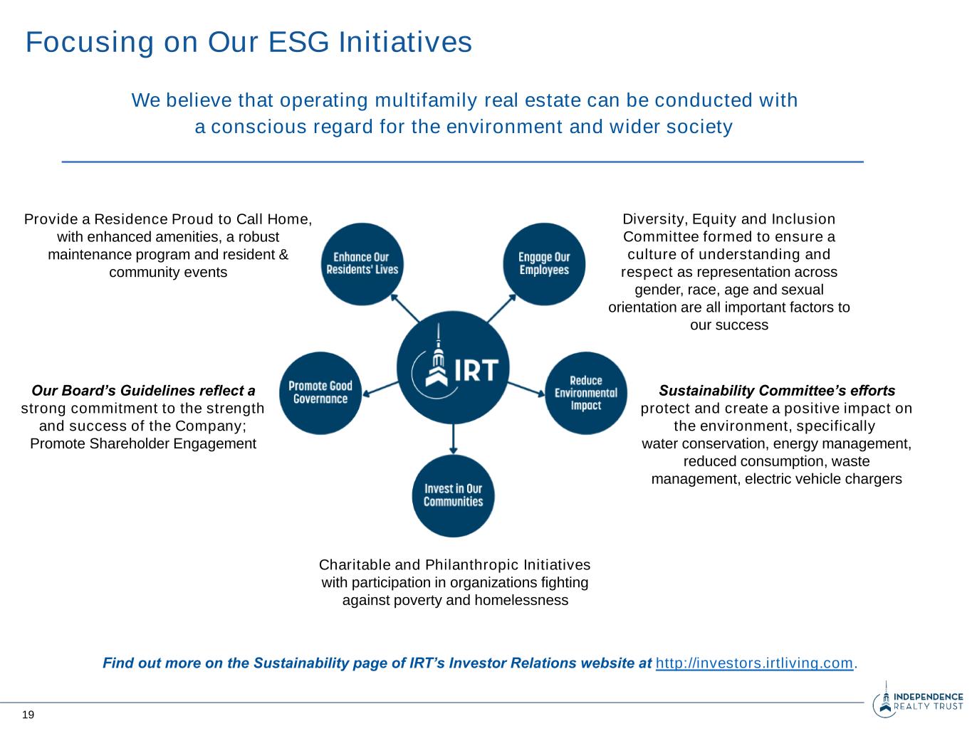 19关注我们的ESG举措我们相信,经营多户型房地产可以在有意识地关注环境和更广泛社会的情况下进行。如需更多信息,请访问IRT投资者关系网站的可持续发展页面:http://investors.irtliving.com。多元化、公平和包容委员会的成立是为了确保在性别、种族、年龄和性取向方面代表理解和尊重的文化,这些都是我们成功的重要因素,可持续发展委员会努力保护和创造对环境的积极影响,特别是节水、能源管理、减少消耗、废物管理、电动汽车充电器慈善和慈善倡议,参与与贫困和无家可归作斗争的组织我们董事会的指导方针反映了对公司实力和成功的坚定承诺;促进股东参与提供一个自豪的家,改善便利设施,一个强大的维护计划和居民及社区活动