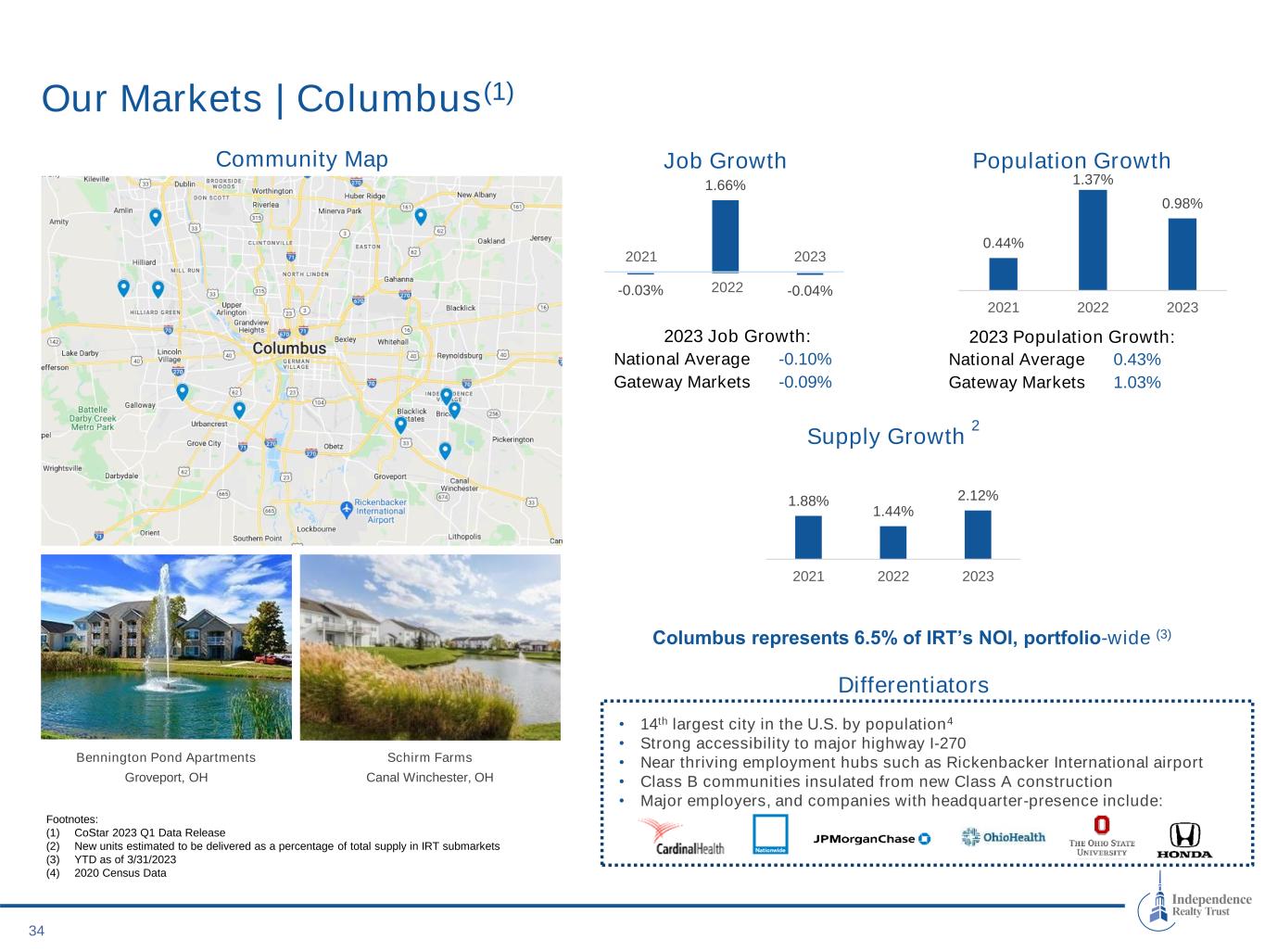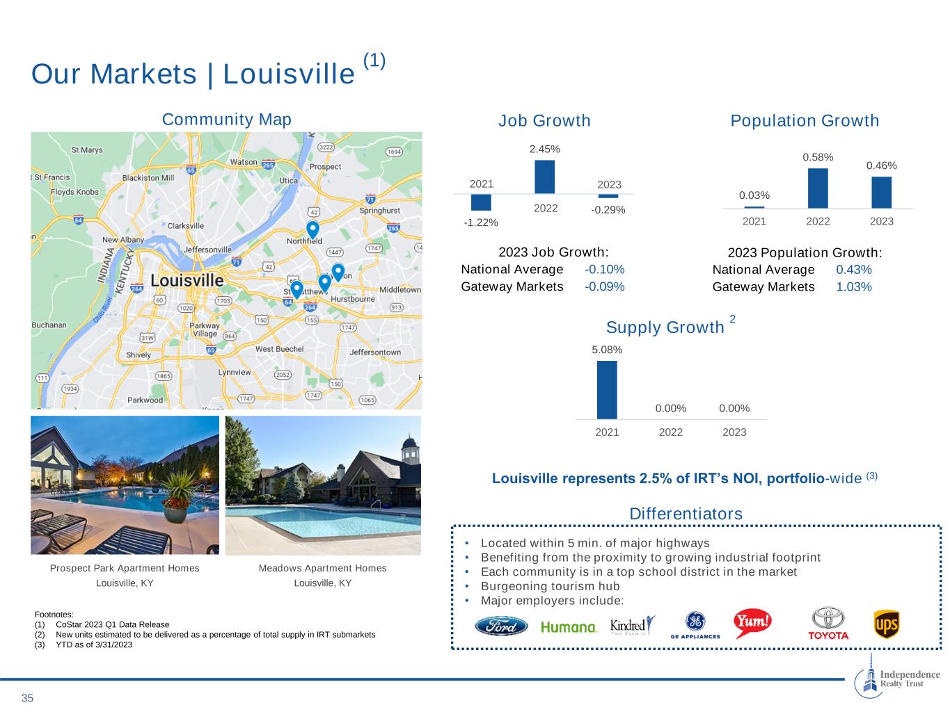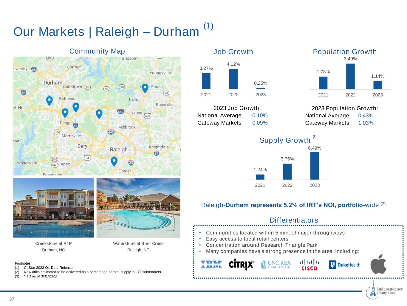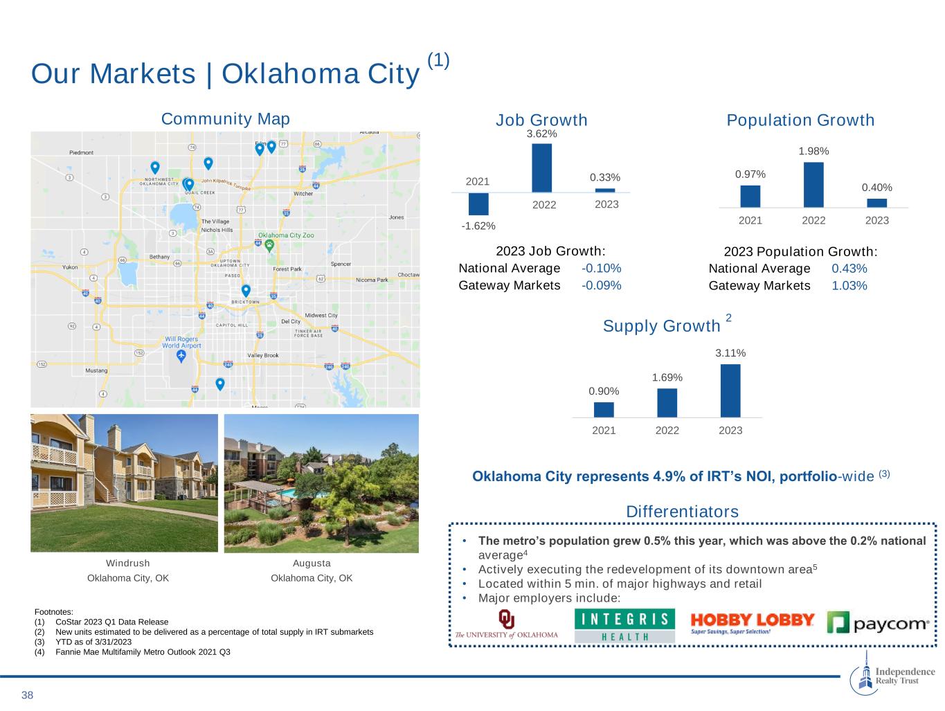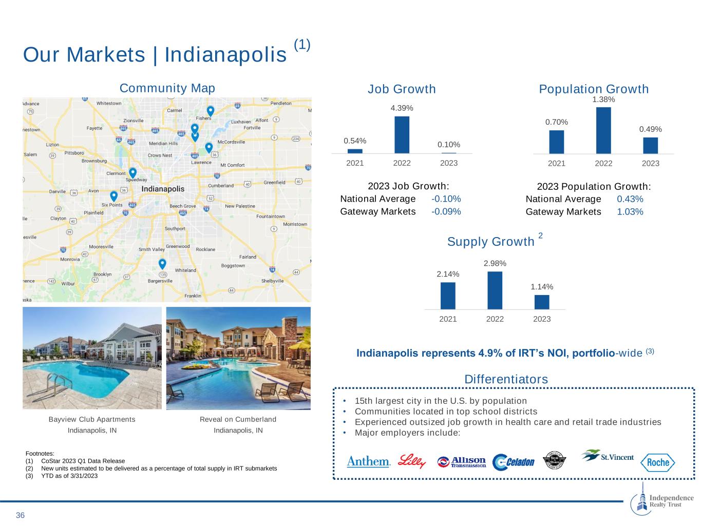 36个社区地图差异化因素就业增长人口增长供应增长22023年就业增长:全国平均-0.10 % Gateway Markets-0.09 % 2023年人口增长:全国平均0.43% Gateway Markets 1.03% •美国第15大城市(按人口计算)•位于顶级学区的社区•医疗保健领域经历了巨大的就业增长和零售贸易行业•主要雇主包括:Our Markets | Indianapolis(1)脚注:(1)CoStar 2023 Q1数据发布(2)估计交付的新单位占IRT子市场总供应量的百分比(3)年初至今截至2023年3月31日Indianapolis占IRT NOI的4.9%,整个投资组合(3)Bayview Club Apartments Indianapolis,IN Reveal on Cumberland Indianapolis,IN 0.54% 4.39% 0.10% 2021202220230.70% 1.38% 0.49% 2021202220232.14% 2.98% 1.14% 202120222023
