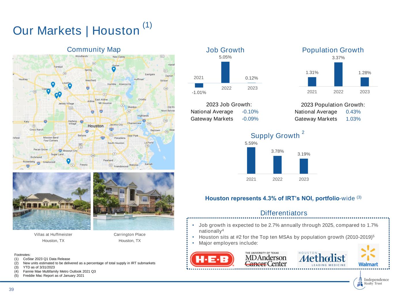 39社区地图差异化因素就业增长人口增长供应增长22023就业增长:全国平均-0.10 % Gateway Markets-0.09 % 2023人口增长:全国平均0.43% Gateway Markets 1.03%-1.01 % 5.05% 0.12% •到2025年,就业增长预计为每年2.7%,与之相比,全美仅为1.7% 4 •休斯顿在人口增长率(2010-2019年)排名前十的管理服务协议中排名第二5 •主要雇主包括:我们的市场|休斯顿(1)脚注:(1)CoStar 2023 Q1数据发布(2)预计交付的新单位占IRT子市场总供应量的百分比(3)截至2023年3月31日的年初至今(4)房利美Multifamily Metro Outlook 2021 Q3(5)房地美报告截至2021年1月休斯顿占IRT NOI的4.3%,整个投资组合(3)Huffmeister Houston的别墅,TX Carrington Place Houston,TX2023202220211.31 % 3.37% 1.28% 2021202220235.59% 3.78% 3.19% 202120222023