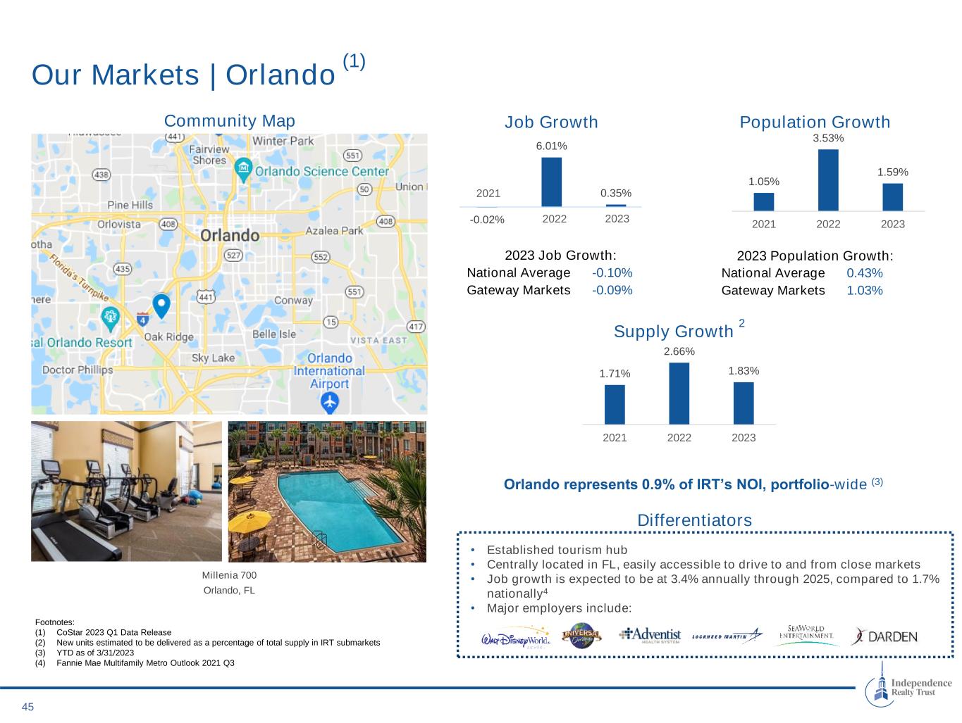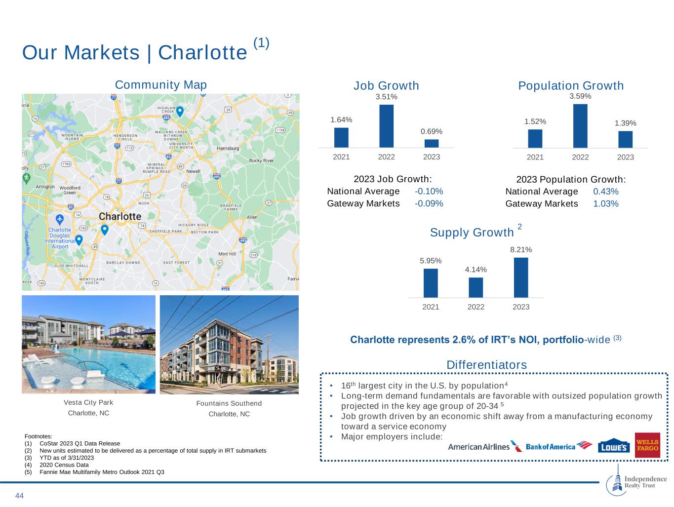 44社区地图差异化因素就业增长人口增长供应增长22023年就业增长:全国平均-0.10 % Gateway Markets-0.09 % 2023年人口增长:全国平均0.43% Gateway Markets 1.03% •美国人口第16大城市4 •长期需求基本面有利,预计20-34岁关键年龄组的人口将出现超常增长5 •经济从制造业经济转向服务经济推动就业增长•主要雇主包括:我们的市场|夏洛特(1)脚注:(1)CoStar 2023 Q1数据发布(2)预计交付的新单位占IRT子市场总供应量的百分比(3)年初至今截至2023年3月31日(4)2020年人口普查数据(5)房利美多户地铁展望2021年第三季度夏洛特占IRT NOI的2.6%,整个投资组合(3)Fountains Southend Charlotte,NC Vesta City Park Charlotte,NC 1.64% 3.51% 0.69% 2021202220231.52% 3.59% 1.39% 2021202220235.95% 4.14% 8.21% 20212022202323