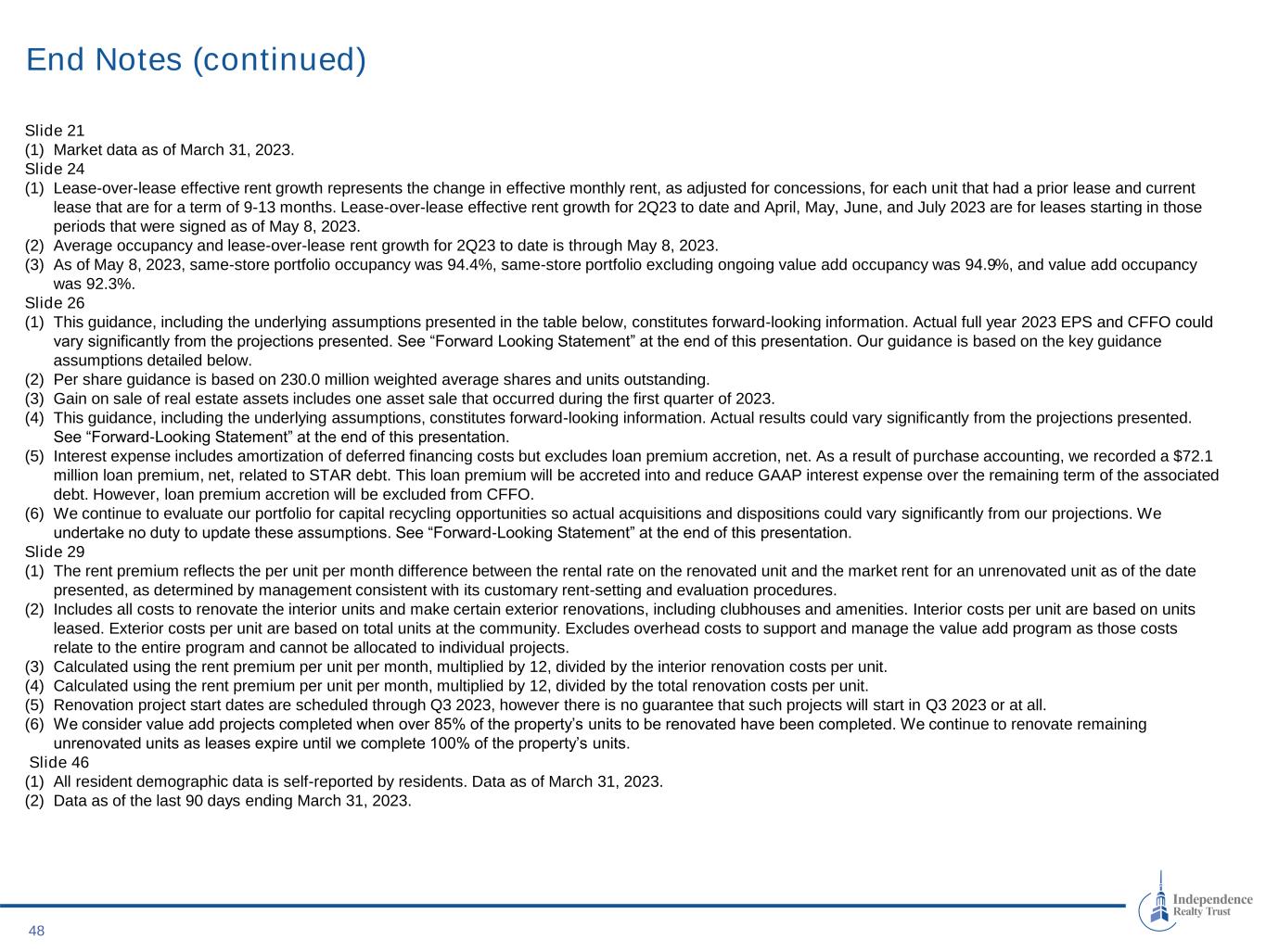 48结尾注(续)幻灯片21(1)截至2023年3月31日的市场数据。幻灯片24(1)租赁超过租赁的实际租金增长是指每个单位的有效月租金的变化,根据优惠调整后,每个单位的先前租约和当前租约的租期为9至13个月。截至2023年5月8日,第二季度和2023年4月、5月、6月和7月的租赁高于租赁的有效租金增长是指从这些期间开始签订的租约。(2)截至2023年5月8日,2Q23的平均入住率和租赁租金增长。(3)截至2023年5月8日,同店组合入住率为94.4%,不包括持续增值的同店组合入住率为94.9%,增值入住率为92.3%。幻灯片26(1)本指南,包括下表所列的基本假设,构成前瞻性信息。2023年实际全年每股收益和CFFO可能与所提供的预测有很大差异。请参阅本演示文稿末尾的“前瞻性陈述”。我们的指导基于下文详述的关键指导假设。(2)每股指引基于2.30亿股加权平均股和流通股。(3)房地产资产出售收益包括2023年第一季度发生的一次资产出售。(4)本指南,包括基本假设,构成前瞻性信息。实际结果可能与所提出的预测有很大差异。请参阅本演示文稿末尾的“前瞻性陈述”。(5)利息支出包括递延融资成本的摊销,但不包括贷款溢价增加的净额。由于采购会计,我们记录了与STAR债务有关的7210万美元贷款溢价净额。这笔贷款溢价将在相关债务的剩余期限内计入并减少GAAP利息支出。然而,贷款溢价增长将被排除在CFFO之外。(6)我们继续评估我们的投资组合,寻找资本回收机会,因此实际的收购和处置可能与我们的预测有很大差异。我们不承担更新这些假设的义务。请参阅本演示文稿末尾的“前瞻性陈述”。幻灯片29(1)租金溢价反映的是管理层根据其惯常的租金确定和评估程序确定的截至提交之日已翻修单元的租金与未翻修单元的市场租金之间的每月单位租金差额。(2)包括翻修内部单位和进行某些外部翻修的所有费用,包括会所和便利设施。每单位的内部费用是根据租赁的单位计算的。每单位的外部费用是根据社区的总单位计算的。不包括支持和管理增值程序的间接费用,因为这些费用与整个程序相关,不能分配给单个项目。(3)计算方法为每月单位租金溢价乘以12,再除以单位内部翻修费用。(4)计算方法为每月单位租金溢价乘以12,再除以单位总翻修费用。(5)翻新工程的开工日期定在2023年第三季度,但不能保证这些工程将在2023年第三季度开工或根本不开工。(6)我们考虑的增值项目完成时,该物业的待装修单元已完成85%以上。随着租约到期,我们将继续翻新剩余的未装修单元,直到我们完成该物业100%的单元。幻灯片46(1)所有居民人口统计数据均由居民自行报告。数据截至2023年3月31日。(2)截至2023年3月31日的最后90天的数据。