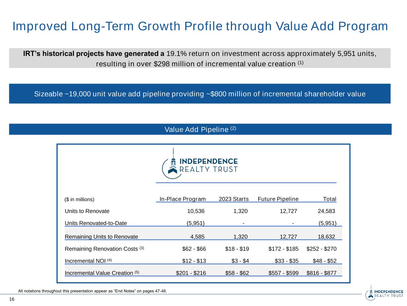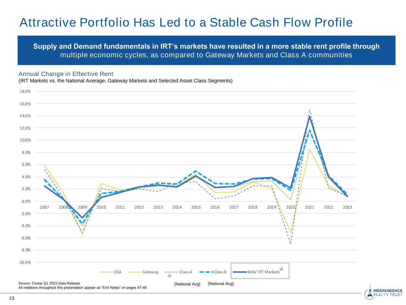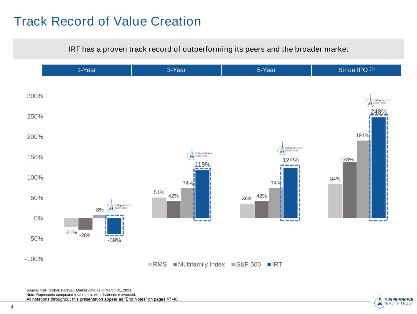 4-21 % 51% 36% 84%-28 % 42% 42% 42% 138% 8% 74% 74% 191%-39 % 118% 124% 248%-100 %-50 %0% 50% 100% 150% 200% 250% 300% RMS Multifamily Index S & P 500 IRT资料来源:标普全球,FactSet。截至2023年3月31日的市场数据。注:代表复合总回报,股息再投资。价值创造记录IRT在过去一年、三年、五年、首次公开发行后的表现优于同行和大盘(1)本演示文稿中的所有注释在第47-48页上显示为“结尾注”。