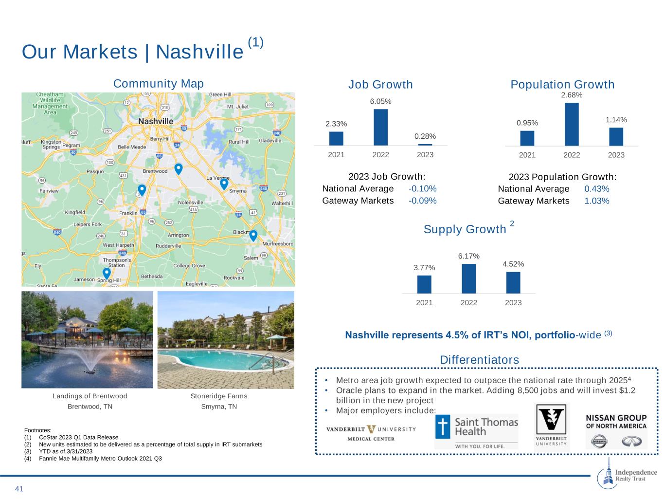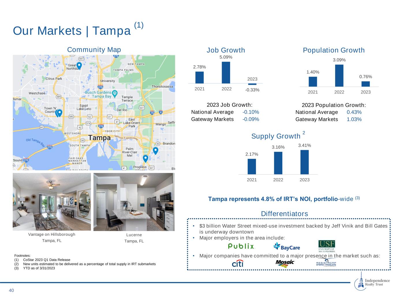 40社区地图差异化因素就业增长人口增长供应增长22023就业增长:全国平均-0.10 % Gateway Markets-0.09 % 2023人口增长:全国平均0.43% Gateway Markets 1.03% • 30亿美元Water Street混合用途投资,由Jeff Vinik支持比尔·盖茨正在市中心工作•该地区的主要雇主包括:•主要公司已承诺在市场上占据重要地位,例如:Our Markets | Tampa(1)脚注:(1)CoStar 2023 Q1数据发布(2)预计交付的新单位占IRT子市场总供应量的百分比(3)截至2023年3月31日的年初至今Tampa占IRT NOI的4.8%,整个投资组合(3)Lucerne Tampa,FL Vantage on Hillsborough Tampa,FL 2023202220212.78% 5.09%-0.33 % 1.40% 3.09% 0.76% 2021202220232.17% 3.16% 3.41% 20220222023