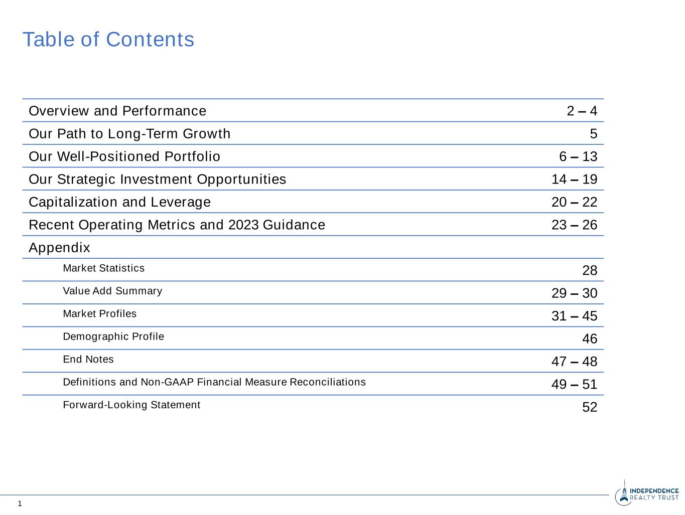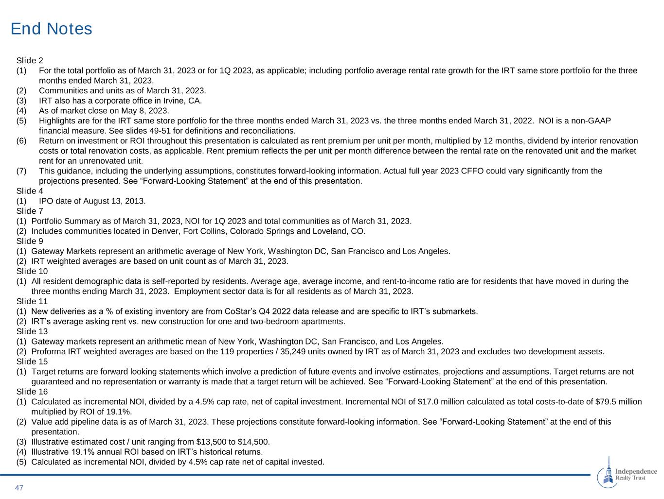 47结束说明幻灯片2(1)适用于截至2023年3月31日或2023年第一季度的投资组合总额;包括截至2023年3月31日止三个月IRT同店投资组合的平均租金增长率。(2)截至2023年3月31日的社区和单位。(3)IRT在加利福尼亚州欧文也有一个公司办事处。(4)截至2023年5月8日收市时止。(5)亮点是截至2023年3月31日的三个月与截至2022年3月31日的三个月的IRT同店组合。NOI是一种非GAAP财务指标。有关定义和调节,请参见幻灯片49-51。(6)在整个演示文稿中,投资回报率或投资回报率的计算方法是每月每单位租金溢价乘以12个月,股息乘以内部翻修费用或总翻修费用(如适用)。租金溢价反映的是已翻修单位的租金与未翻修单位的市场租金之间的每月单位租金差额。(7)本指南,包括基本假设,构成前瞻性信息。2023年CFFO的实际全年可能与所提出的预测有很大差异。请参阅本演示文稿末尾的“前瞻性陈述”。幻灯片4(1)IPO日期为2013年8月13日。幻灯片7(1)截至2023年3月31日的投资组合摘要、2023年第一季度的NOI和截至2023年3月31日的社区总数。(2)包括位于丹佛、柯林斯堡、科罗拉多斯普林斯和科罗拉多州拉夫兰的社区。幻灯片9(1)Gateway Markets代表纽约、华盛顿特区、旧金山和洛杉矶的算术平均值。(2)IRT加权平均数是根据截至2023年3月31日的单位数目计算的。幻灯片10(1)所有居民人口统计数据均由居民自行报告。平均年龄、平均收入和房租收入比是指在截至2023年3月31日的三个月内搬入的居民。就业部门数据为截至2023年3月31日的所有居民。幻灯片11(1)新交付占现有库存的百分比来自CoStar发布的2022年第四季度数据,具体针对IRT的子市场。(2)IRT的平均租金与新建一居室和两居室公寓的对比。幻灯片13(1)网关市场代表纽约、华盛顿特区、旧金山和洛杉矶的算术平均值。(2)形式上的IRT加权平均数是根据截至2023年3月31日IRT拥有的119处房产/35,249个单位计算的,不包括两项开发资产。幻灯片15(1)目标回报是前瞻性陈述,涉及对未来事件的预测,并涉及估计、预测和假设。不保证目标收益,也不表示或保证将实现目标收益。请参阅本演示文稿末尾的“前瞻性陈述”。幻灯片16(1)计算为增量NOI,除以4.5%的上限利率,扣除资本投资。按迄今7950万美元的总成本乘以19.1%的ROI计算,新增NOI为1700万美元。(2)增值管道数据截至2023年3月31日。这些预测构成前瞻性信息。请参阅本演示文稿末尾的“前瞻性陈述”。(3)说明性估计费用/单位从13500美元至14500美元不等。(4)基于IRT历史回报率的年回报率为19.1%。(5)计算为增量NOI,除以4.5%的资本净上限率。
