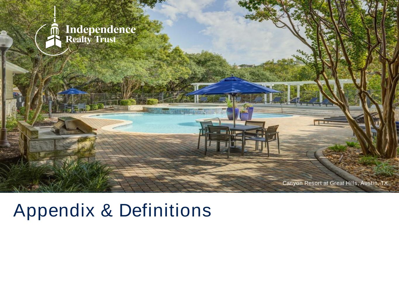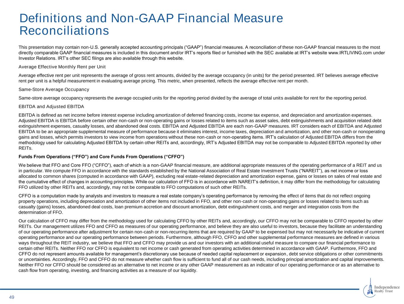 49定义和非公认会计原则财务指标的对账本演示文稿可能包含非美国公认会计原则(“GAAP”)财务指标。这些非GAAP财务指标与最直接可比的GAAP财务指标的对账包含在本文件和/或IRT提交或提供给SEC的报告中,这些报告可在IRT网站www.IRTLIVING.com的“投资者关系”下查阅。IRT提交给美国证交会的其他文件也可通过该网站查阅。每单位平均有效月租金每单位平均有效租金是所列期间租金毛额除以平均入住率(单位)的平均数。IRT认为,单位平均有效租金是评估平均价格的一个有用的量度。这一指标在提出时反映了每月平均有效租金。同店平均入住率同店平均入住率是指本报告所述期间的平均入住率除以本报告所述期间可供出租的单位总数的平均数。EBITDA和调整后EBITDA EBITDA定义为扣除利息费用前的净收入,包括递延融资成本的摊销、所得税费用以及折旧和摊销费用。调整后的EBITDA是指与资产出售、债务清偿和收购相关的债务清偿费用、伤亡损失和放弃交易成本等项目相关的某些其他非现金或非经营性损益之前的EBITDA。EBITDA和调整后EBITDA均为非公认会计原则衡量标准。IRT认为,EBITDA和调整后EBITDA都是业绩的适当补充衡量标准,因为它消除了利息、所得税、折旧和摊销以及其他非现金或非经营性损益,使投资者能够在没有这些非现金或非经营性项目的情况下查看营业收入。IRT对调整后EBITDA的计算不同于某些其他房地产投资信托基金计算调整后EBITDA的方法,因此,IRT的调整后EBITDA可能无法与其他房地产投资信托基金报告的调整后EBITDA进行比较。运营资金(简称“FFO”)和核心运营资金(简称“CFFO”)我们认为,FFO和核心FFO(简称“CFFO”)都是一种非公认会计准则财务指标,它们是衡量房地产投资信托基金(尤其是我们)运营业绩的额外适当指标。我们根据全国房地产投资信托协会(National Association of Real Estate Investment Trusts,简称“NAREIT”)制定的标准计算FFO,即分配给普通股的净收益或亏损(按照公认会计原则计算),不包括与房地产相关的折旧和摊销费用、房地产销售的收益或亏损以及会计原则变更的累积影响。尽管我们对FFO的计算符合NAREIT的定义,但它可能与其他REITs使用的FFO计算方法不同,因此可能无法与其他REITs的FFO计算进行比较。CFFO是一种由分析师和投资者进行的计算,通过剔除不反映正在进行的房地产运营的项目的影响来衡量房地产公司的经营业绩,包括未包括在FFO中的其他项目的折旧和摊销,以及与伤亡(收益)损失、放弃交易成本、贷款溢价和贴现摊销、债务清偿成本以及合并和整合成本等项目相关的其他非现金或非经营性损益。我们对CFFO的计算可能与其他REITs计算CFFO的方法不同,因此,我们的CFFO可能无法与其他REITs报告的CFFO进行比较。我们的管理层使用FFO和CFFO作为我们经营业绩的衡量标准,并相信它们对投资者也很有用,因为它们有助于理解我们在对某些非现金或非经常性项目进行调整后的经营业绩,这些项目按照公认会计原则需要计入费用,但不一定代表当前的经营业绩和我们在不同时期的经营业绩。此外,尽管FFO、CFFO和其他补充业绩衡量标准在整个房地产投资信托行业有不同的定义,但我们相信FFO和CFFO可能为我们和我们的投资者提供一个额外的有用衡量标准,将我们的财务业绩与某些其他房地产投资信托基金进行比较。FFO和CFFO都不等同于根据公认会计原则确定的净收入或经营活动产生的现金。此外,FFO和CFFO并不代表管理层可酌情使用的金额,因为需要资本置换或扩张、偿债义务或其他承诺或不确定性。因此,FFO和CFFO没有衡量现金流是否足以满足我们所有的现金需求, 包括本金摊销和资本改进。无论是FFO还是CFFO都不应被视为净收入或任何其他GAAP衡量指标的替代指标,也不应被视为经营、投资和融资活动现金流的替代指标,作为衡量我们流动性的指标。