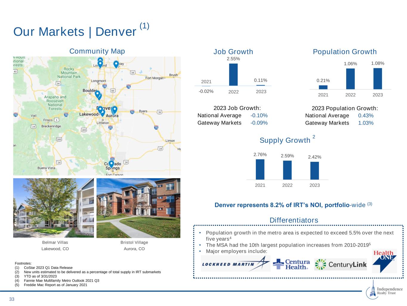 33社区地图差异化因素就业增长人口增长供应增长22023就业增长:全国平均-0.10 % Gateway Markets-0.09 % 2023人口增长:全国平均0.43% Gateway Markets 1.03%-0.02 % 2.55% 0.11% •预计未来五年都市地区的人口增长将超过5.5% 4 •从2010年到2019年,MSA的人口增长排在第10位95 •主要雇主包括:Our Markets | Denver(1)脚注:(1)CoStar 2023 Q1数据发布(2)预计交付的新单位占IRT子市场总供应的百分比(3)年初至今截至2023年3月31日(4)Fannie Mae Multifamily Metro Outlook 2021 Q3(5)Freddie Mac Report at January 2021 Denver represents 8.2% of IRT NOI,portfolio wide(3)Belmar Villas Lakewood,CO Bristol Village Aurora,CO 2023202220210.21% 1.06% 1.08% 2021202220232.76% 2.59% 2.42% 202120222023