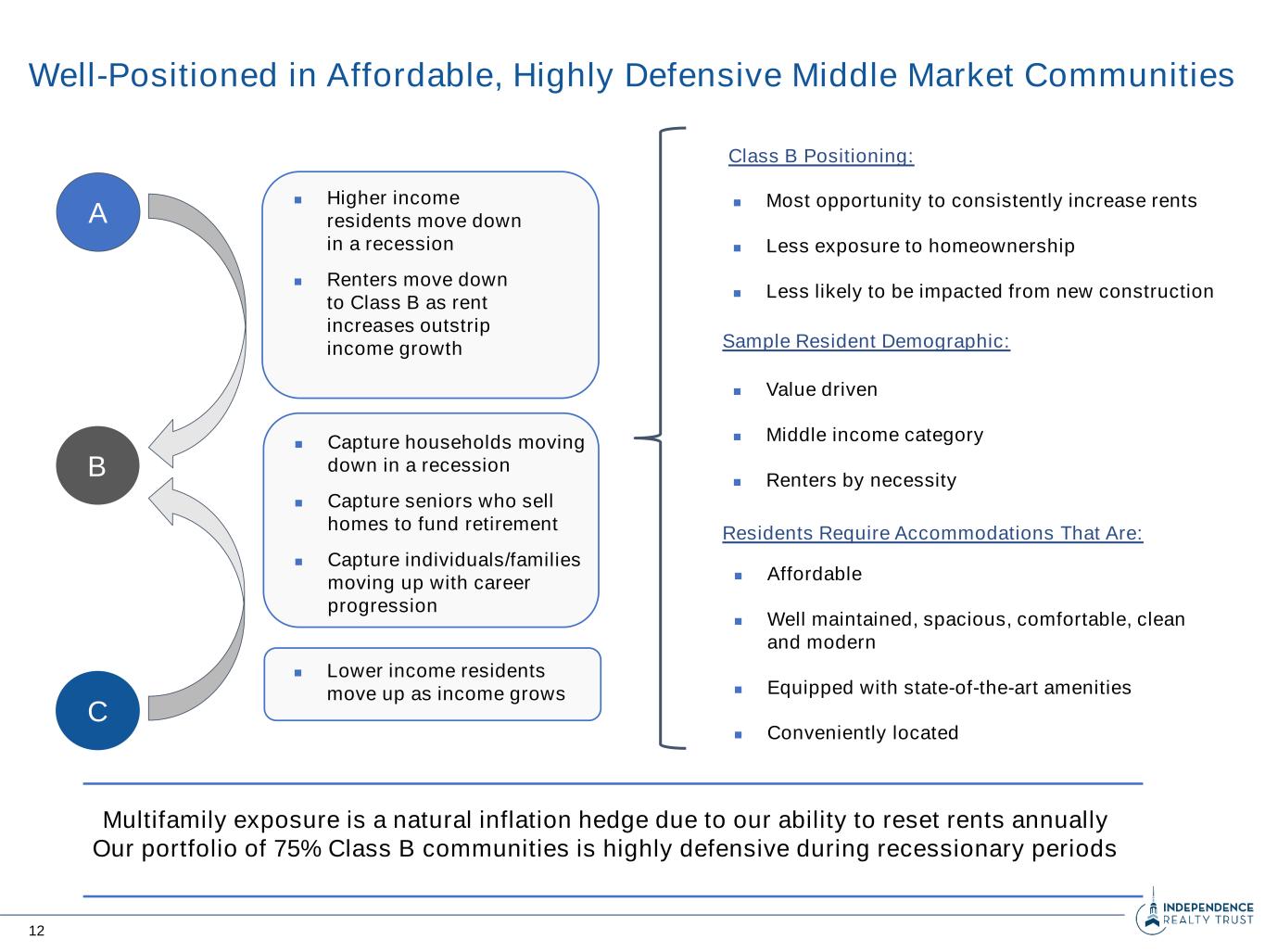 11新供应对IRT的影响不会很大2023年和2024年IRT市场的新公寓交付量占现有公寓存量的百分比预计将与近期历史大体一致,IRT的B级社区不会与新的A级开发项目直接竞争。平均而言,对于2022年期间的新交付,IRT的租金低于新公寓每月约500美元或25%(2)(1)3.3% 2.8% 2.6% 2.8% 2.4% 2020202120222023E 2024E新交付占现有库存的百分比$ 0 $ 500 $ 1,000 $ 1,500 $ 2,000 $ 2,500 Atlanta Dallas-Fort Worth Denver Columbus Raleigh-Durham Indianapolis Oklahoma City Tampa Nashville Houston Total/WAV IRT New Construction 25%较低租金