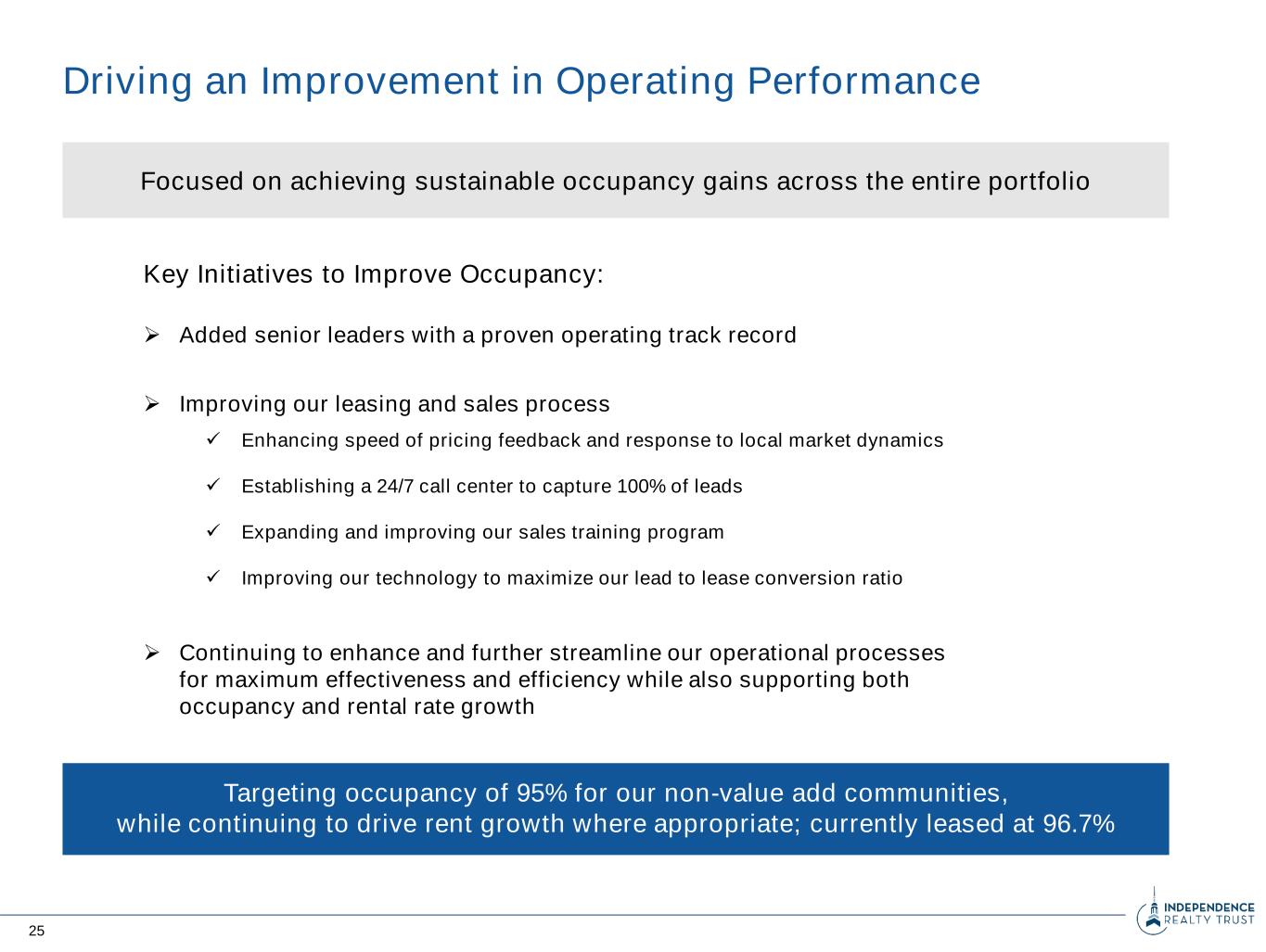 25推动经营业绩的改善专注于在整个投资组合中实现可持续的入住率增长,目标是非增值社区的入住率达到95%,同时继续酌情推动租金增长;目前出租率为96.7%提高入住率的关键举措:▏增加了具有可靠运营记录的高级领导人士︱改进我们的租赁和销售流程➤提高价格反馈和对当地市场动态的反应速度¶建立一个全天候的呼叫中心,以100%地获取潜在客户TERM1扩大和改进我们的销售培训计划¶改进我们的技术,以最大限度地提高我们的潜在客户到租赁的转换率▏继续加强和进一步简化我们的运营流程,以实现最大的效率和效率,同时支持双方的入住率和租金增长