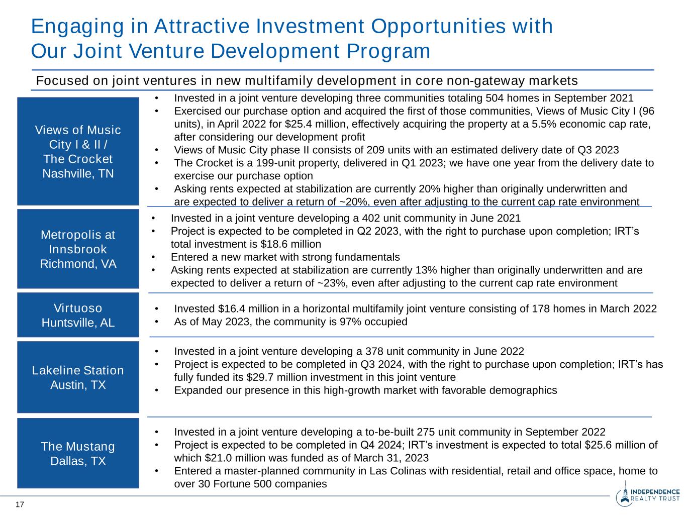 16 In-Place Program 2023 Starts Future Pipeline Total Units to Renovate 10,5361,32012,72724,583 Units Renovated-Date(5,951)--(5,951)Remaining Units to Renovate 4,5851,32012,72718,632 Remaining Renovation Costs(3)$ 62-$ 66 $ 18-$ 19 $ 172-$ 185 $ 252-$ 270 Incremental NOI(4)$ 12-$ 13 $ 3-$ 4 $ 33-$ 35 $ 48-$ 52 Incremental Value Creation(5)$ 201-$ 216 $ 58-$ 62 $ 557-$ 599 $ 816-$ 877 Improved Long(2)(百万美元)本演示文稿中的所有注释在第47-48页上显示为“结尾处注释”。IRT的历史项目在大约5951个单元中产生了19.1%的投资回报率,创造了超过2.98亿美元的增量价值(1)