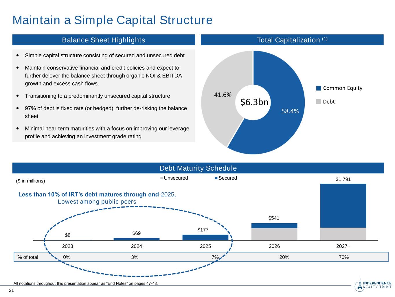 2158.4% 41.6%保持简单的资本Structure 63亿美元普通股债务简单的资本结构包括有担保和无担保债务保持保守的财务和信贷政策,并期望通过有机的NOI & EBITDA增长和超额现金流进一步去杠杆化资产负债表。向以无担保为主的资本结构过渡97%的债务是固定利率(或对冲),进一步降低资产负债表的风险最小的短期到期,重点是改善我们的杠杆状况并实现投资级评级总资本(1)资产负债表亮点债务到期时间表$ 8 $ 69 $ 177 $ 541 $ 1,791 20232024202520262027 +无担保担保占总额的百分比0% 3% 7% 20% 70%(百万美元)本演示文稿中的所有符号都显示为第47-48页的“结尾注”。到2025年底,只有不到10%的IRT债务到期,这在公共部门同行中是最低的