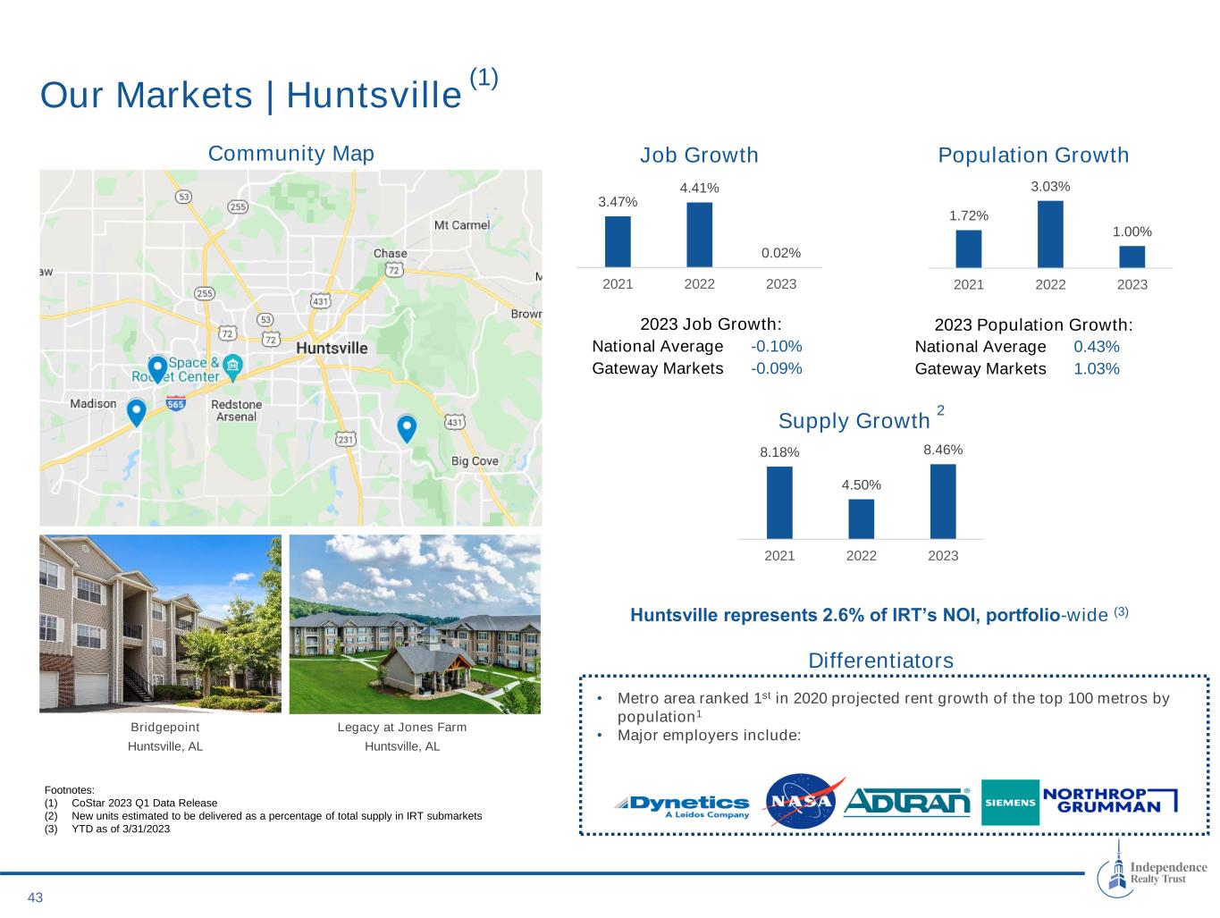 43社区地图差异化因素就业增长人口增长供应增长22023年就业增长:全国平均-0.10 % Gateway Markets-0.09 % 2023年人口增长:全国平均0.43% Gateway Markets 1.03% •都会区在2020年排名第1在人口最多的100个都会区中预计租金增长1 •主要雇主包括:Our Markets | Huntsville(1)脚注:(1)CoStar 2023 Q1数据发布(2)预计交付的新单位占IRT子市场总供应的百分比(3)年初至今截至2023年3月31日Huntsville占IRT NOI的2.6%,投资组合范围(3)Bridgepoint Huntsville,AL Legacy at Jones Farm Huntsville,美国铝业3.47% 4.41% 0.02% 2021202220231.72% 3.03% 1.00% 2021202220238.18% 4.50% 8.46% 202120222023