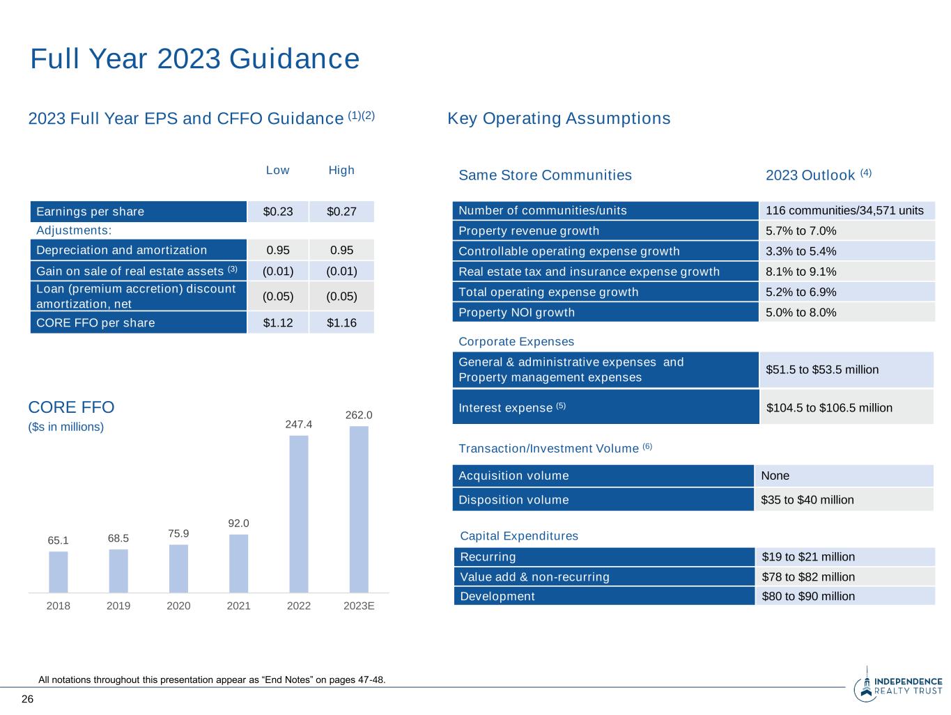262023全年EPS和CFFO指引(1)(2)低-高每股收益0.23美元0.27美元调整:折旧和摊销0.95 0.95房地产资产出售收益(3)(0.01)(0.01)贷款(溢价增值)贴现摊销,每股净值(0.05)(0.05)CORE FFO每股1.12美元1.16美元CORE FFO(百万美元)同店社区2023年展望(4)社区/单位数量116个社区/34,571个单位物业收入增长5.7%至7.0%可控运营费用增长3.3%至5.4%房地产税和保险费用增长8.1%至9.1%总运营费用增长5.2%至6.9%物业NOI增长5.0%至8.0%主要运营假设公司费用一般和管理费用物业管理费用51.5至5350万美元资本支出经常性19至2100万美元增值和非经常性78至8200万美元开发8至9000万美元交易/投资数量(6)收购量无处置数量35至4000万美元利息支出(5)1.04.5至1.065亿美元2023年全年指导本演示文稿中的所有注释都显示为第47-48页的“结尾注”。65.168.575.99 2.02 47.4262.0201820192020202120222023E