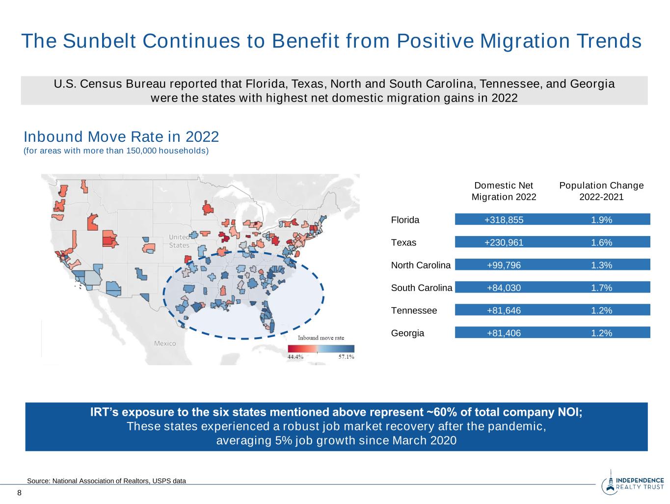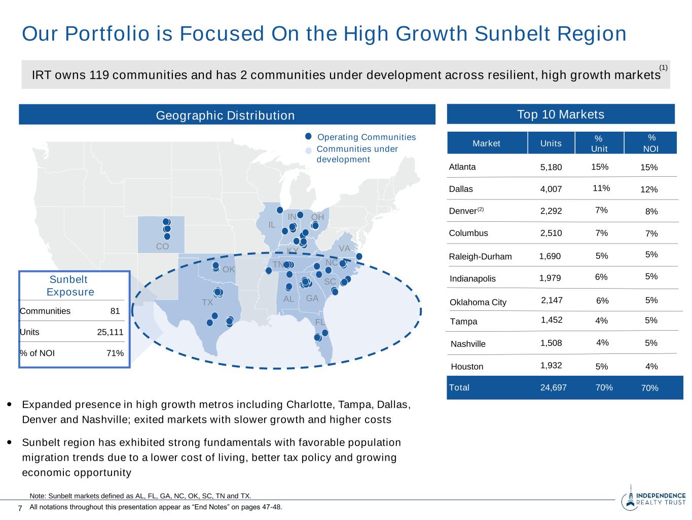 7个十大市场:我们的投资组合聚焦于高增长的阳光地带地区投资组合摘要地理分布IRT拥有119个社区,并有2个社区正在开发中,横跨有弹性的高增长市场,经营社区扩大在高增长的大都市的业务,包括夏洛特、坦帕、达拉斯、丹佛和纳什维尔;已退出的市场增长较慢,成本较高,由于生活成本较低,阳光地带地区表现出强劲的基本面和有利的人口迁移趋势,更好的税收政策和不断增长的经济机会(2)社区平均年龄(2)22岁130社区37,828单位$ 6.2B总资产TBU Desktop FL GAALTX CO OK IL IN OH KY TN SC NC VA Sunbelt曝光社区81单位25,111% NOI 71%(1)市场单位%单位% NOI亚特兰大5,18015% 15%达拉斯4,00711% 12%丹佛2,2927% 8%哥伦布2,5107.7% 1,979印第安纳波利斯6% 5%罗利-达勒姆1,6906% 5%俄克拉荷马城2,1475% 5%休斯顿1,9325% 4%坦帕1,4514% 5% 5%总计24,69770% 70% 70%出现在整个演示文稿中的所有符号作为第47-48页的“结尾语”。注:阳光地带市场定义为AL、FL、GA、NC、OK、SC、TN和TX。纳什维尔1,5085% 4%发展中社区