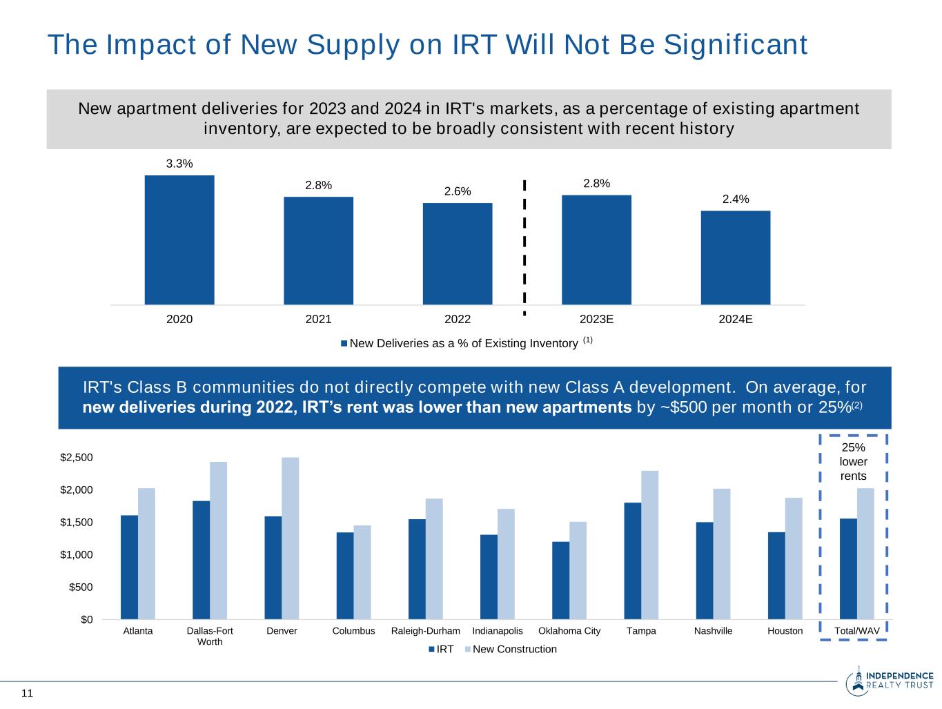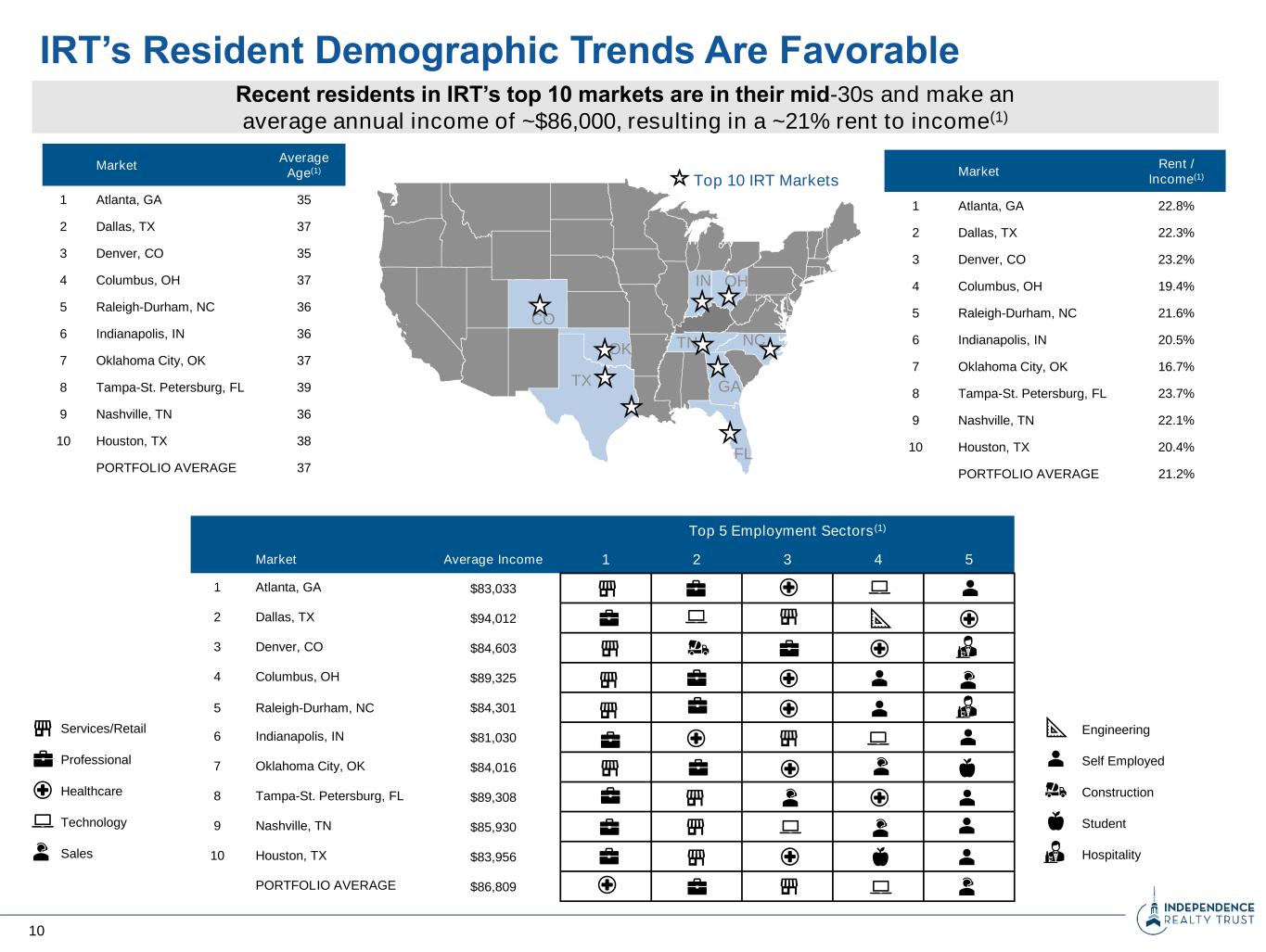 10 IRT的居民人口趋势是有利的最近IRT十大市场的居民年龄在30多岁左右,平均年收入约为86,000美元,租金收入比约为21%(1)十大IRT市场平均社区年龄(2)22岁130个社区37,828个单位$ 6.2B总资产TBU Desktop GATX CO OK IN OH FL TN NC Market Average Age(1)1 Atlanta,GA 352 Dallas,TX 373 Denver,CO 354 Columbus,OH 375Raleigh-Durham,NC 366 Indianapolis,IN 367 Oklahoma City,OK 378 Tampa-St. Petersburg,FL 399 Nashville,TN 3610 Houston,TX 38 PORTFOLIO Average 37 Top 5 Employment Sectors(1)Market Average Income 123451 Atlanta,GA $ 83,0332 Dallas,TX $ 94,0123 Denver,CO $ 84,6034 Columbus,NC $ 89,3255 Raleigh-Durham,NC $ 84,3016 Indianapolis,IN $ 81,030 7 Oklahoma City,OK $ 84,0168 Tampa-St. Petersburg,FL $ 89,3089 Nashville,TN $ 85,93010 Houston,TX $ 83,956 PORTFOLIO Average $ 86,809 Market Rent/Income(1)1 Atlanta,GA 22。OK 16.7% 8 Tampa-St. Petersburg,FL 23.7% 9 Nashville,TN 22.1% 10 Houston,TX 20.4% PORTFOLIO AVERAGE 21.2% Services/Retail Professional Healthcare Technology Sales Engineering Self-Employed Construction Student Hospitality