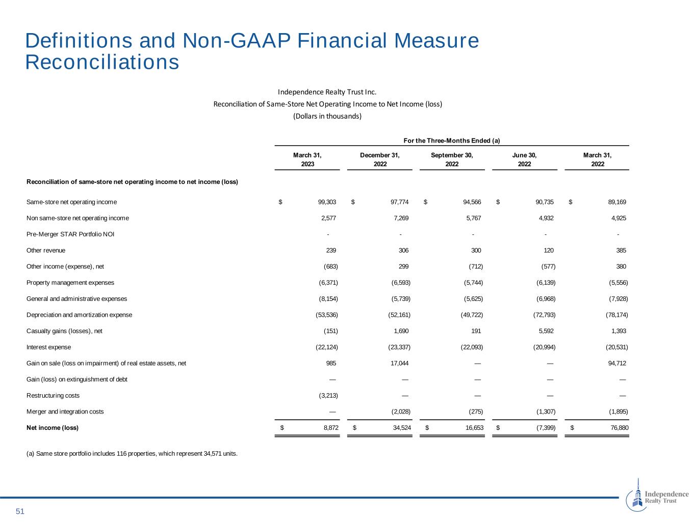 51定义和非公认会计原则财务指标调节2023年3月31日2022年9月30日2022年6月30日2022年3月31日同店净营业收入与净收入(亏损)的调节同店净营业收入99,303美元97,774美元94,566美元90,735美元89,169美元非同店净营业收入2,5777,2695,7674,9324,925合并前STAR投资组合NOI-----其他收入239306300120385其他收入(费用),净额(683)299(712)(577)380物业管理费用(6,371)(6,593)(5,744)(6,139)(5,556)一般及行政费用(8,154)(5,739)(5,625)(6,968)(7,928)折旧及摊销费用(53,536)(52,161)(49,722)(72,793)(78,174)伤亡收益(损失),净额(151)1,6901915,5921,393利息费用(22,124)(23,337)(22,093)(20,994)(20,531)房地产资产出售收益(减值损失),净额98517,044 —— 94,712债务清偿收益(损失)————重组成本(3,213)————合并和整合成本——(2,028)(275)(1,307)(1,895)净收入(损失)8,872美元34,524美元16,653美元(7,399)76,880美元(a)同店组合包括116处房产,代表34,571个单位。(a)独立房地产信托公司同店净营业收入与净收入(亏损)的对账(千美元)