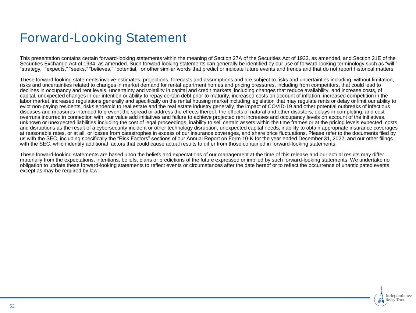 52前瞻性陈述本演示文稿包含经修订的1933年《证券法》第27A条和经修订的1934年《证券交易法》第21E条含义内的某些前瞻性陈述。这类前瞻性陈述通常可以通过我们使用前瞻性术语来识别,例如“将”、“战略”、“预期”、“寻求”、“相信”、“潜在”,或其他类似的词,这些词预测或指示未来的事件和趋势,但不报告历史事件。这些前瞻性陈述涉及估计、预测、预测和假设,并受到风险和不确定性的影响,包括但不限于与租赁公寓市场需求变化和定价压力(包括来自竞争对手的压力)相关的风险和不确定性,这些风险和不确定性可能导致入住率和租金水平下降,资本和信贷市场的不确定性和波动性,包括降低资本可用性和增加资本成本的变化,我们在到期前偿还某些债务的意图或能力发生意外变化,通货膨胀导致成本增加,劳动力市场竞争加剧,加强对租赁住房市场的总体和具体的监管,包括可能监管租金或延迟或限制我们驱逐不付钱的居民的能力的立法、房地产和整个房地产行业的特有风险、新冠疫情的影响和其他传染病的潜在爆发,以及旨在防止传播或解决其影响的措施、自然灾害和其他灾害的影响、延迟完工以及与我们的增值举措相关的成本超支,以及由于这些举措而未能实现预期的租金上涨和入住率水平,未知或意外的责任,包括法律诉讼的费用、无法在时限内或以预期的定价水平出售某些资产、网络安全事件或其他技术中断造成的费用和中断、意外的资金需求、无法以合理的费率获得适当的保险,或根本无法获得保险,或超出我们保险范围的巨灾造成的损失,以及股价波动。请参阅我们向SEC提交的文件,特别包括我们截至2022年12月31日止年度的10-K表格年度报告中的“风险因素”部分,以及我们向SEC提交的其他文件,这些文件确定了可能导致实际结果与前瞻性陈述中包含的结果不同的其他因素。这些前瞻性陈述基于我们管理层在本新闻稿发布时的信念和期望,我们的实际结果可能与这些前瞻性陈述所表达或暗示的对未来的期望、意图、信念、计划或预测存在重大差异。我们不承担更新这些前瞻性陈述以反映本协议日期之后的事件或情况或反映意外事件的发生的义务,除非法律可能要求。