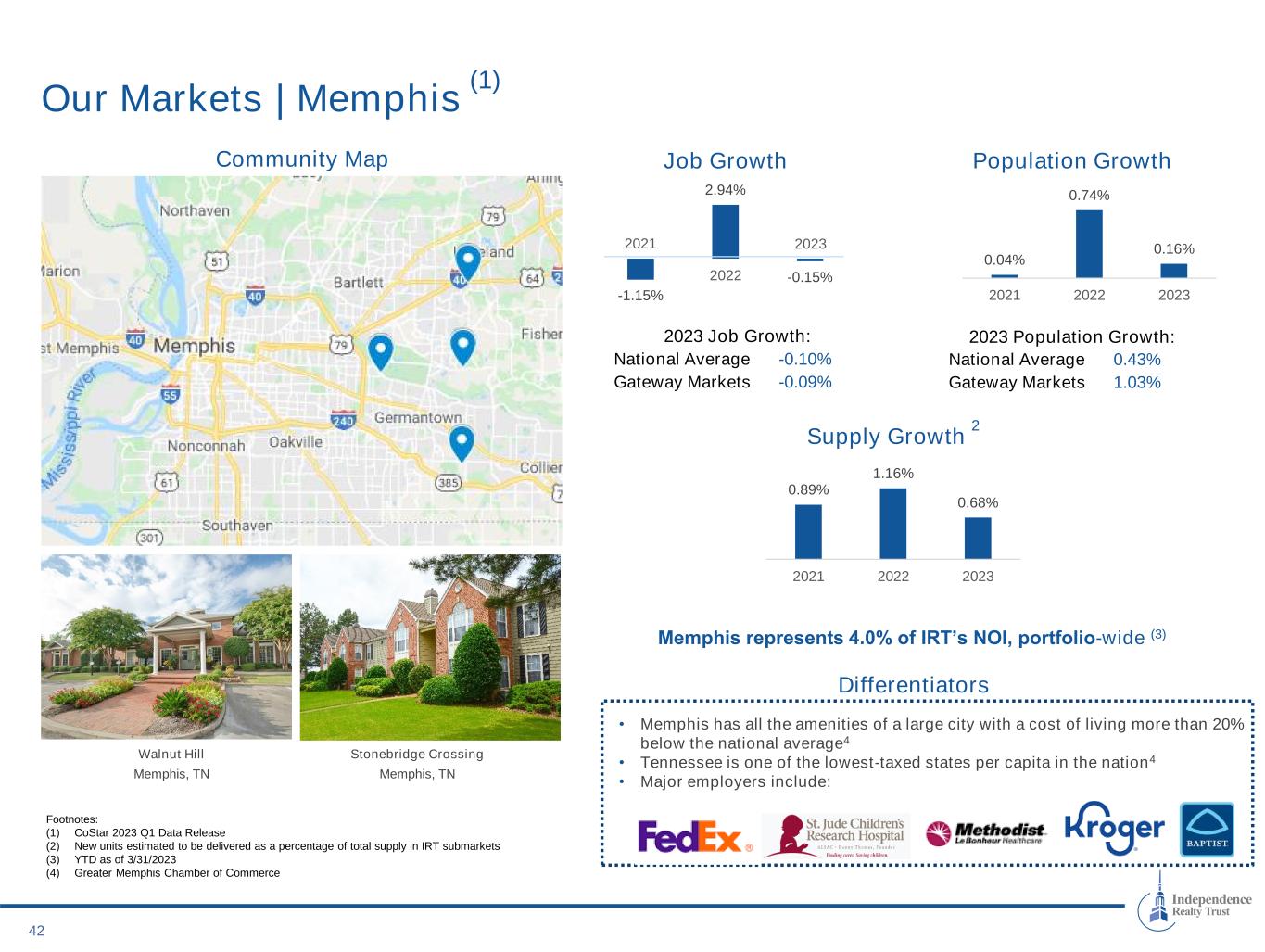 41社区地图差异化因素就业增长人口增长供应增长22023年就业增长:全国平均-0.10 %网关市场-0.09 % 2023年人口增长:全国平均0.43%网关市场1.03% •到20254年,都会区就业增长预计将超过全国水平•甲骨文计划在该市场进行扩张。新增8500个工作岗位,并将在新项目上投资12亿美元•主要雇主包括:我们的市场|纳什维尔(1)脚注:(1)CoStar 2023 Q1数据发布(2)预计交付的新单位占IRT子市场总供应量的百分比(3)截至2023年3月31日的年初至今(4)房利美Multifamily Metro Outlook 2021 Q3 Nashville占IRT NOI的4.5%,整个投资组合(3)Brentwood Brentwood、TN 斯通里奇农场Smyrna、TN 2.33% 6.05% 0.28% 2021202220230.95% 2.68% 1.14% 2021202220233.77% 6.17% 4.52% 2021202220222023
