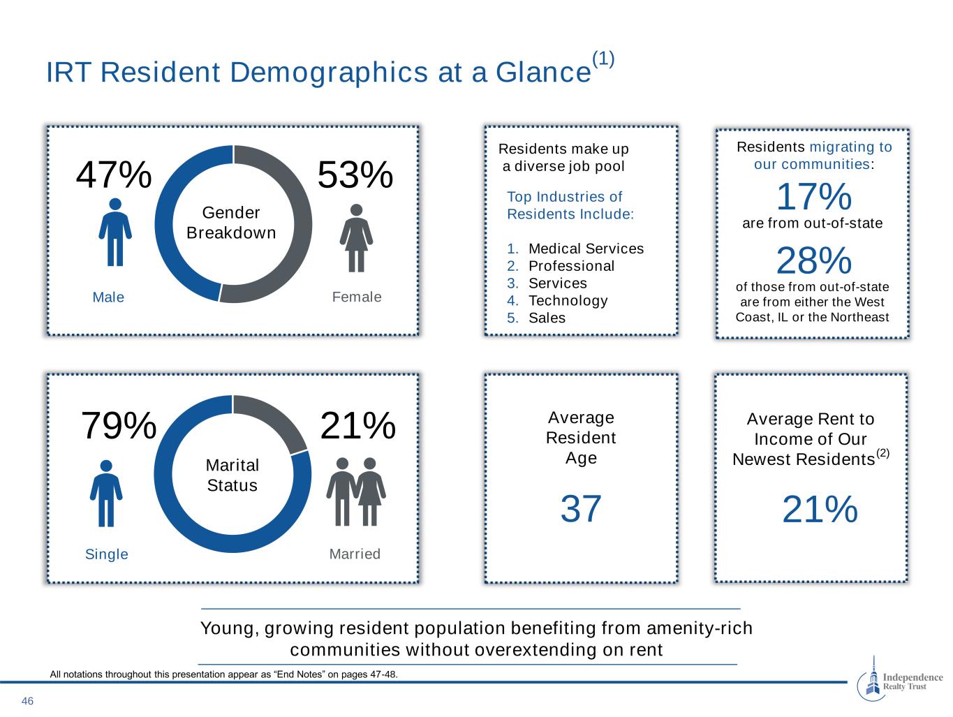 46《IRT居民人口统计概览》(1)本演示文稿中的所有记号都在第47-48页上以“结尾语”的形式出现。47% 53%性别分类79% 21%婚姻状况37居民平均年龄年轻,不断增长的居民人口受益于设施丰富的社区而不会过度出租居民组成了一个多样化的就业岗位主要居民行业包括:1。医疗服务2。专业人员3。服务4。技术5。销售男性女性单身已婚居民组成了一个多样化的就业岗位迁移到我们社区的居民:我们最新居民的平均租金与收入(2)21% 17%来自外州28%来自外州的居民来自西海岸、伊利诺伊州或东北部