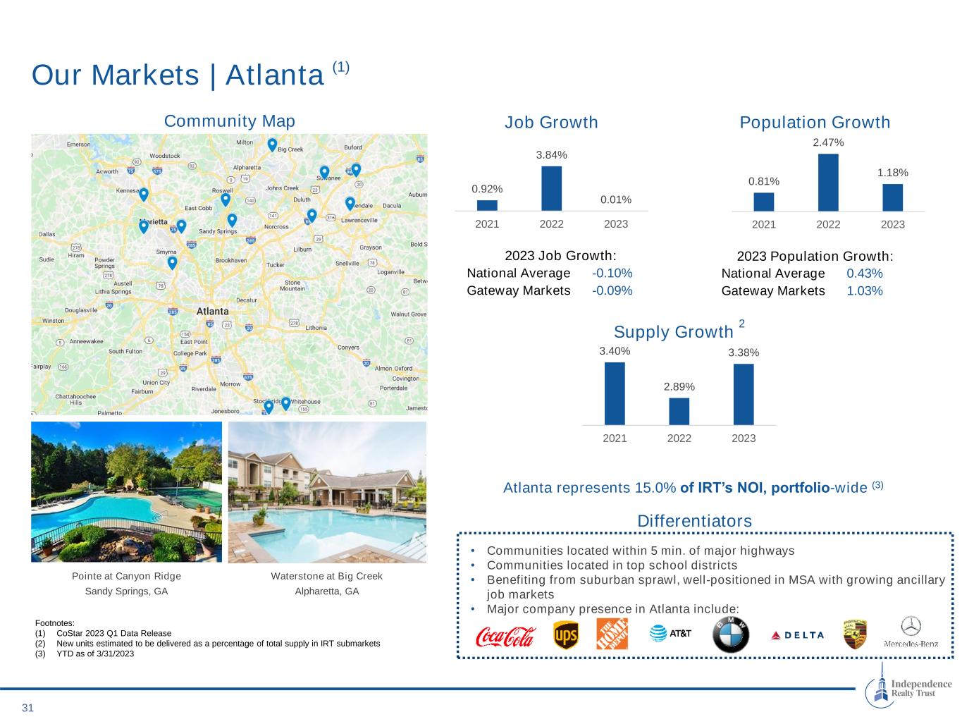 31社区地图差异化因素就业增长人口增长供应增长22023年就业增长:全国平均-0.10 %网关市场-0.09 % 2023年人口增长:全国平均0.43%网关市场1.03% •位于主要高速公路5分钟以内的社区•位于顶级学区的社区•受益于郊区扩张,在MSA处于有利地位,辅助就业市场不断增长•亚特兰大的主要公司包括:我们的市场|亚特兰大(1)脚注:(1)CoStar 2023 Q1数据发布(2)预计交付的新单位占IRT子市场总供应量的百分比(3)截至2023年3月31日的年初至今亚特兰大占IRT NOI的15.0%,整个投资组合(3)Pointe at Canyon Ridge Sandy Springs,GA Waterstone at Big Creek Alpharetta,GA 0.92% 3.84% 0.01% 2021202220230.81% 2.47% 1.18% 2021202220233.40% 2.89% 3.38% 202120222023