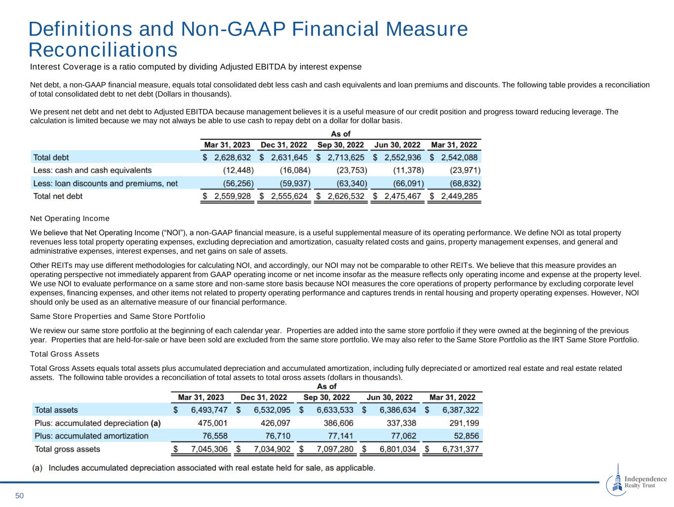 50个定义和非GAAP财务指标调节净营业收入我们认为,净营业收入(“NOI”)是一种非GAAP财务指标,是衡量其经营业绩的有用的补充指标。我们将NOI定义为总物业收入减去总物业运营费用,不包括折旧和摊销、伤亡相关成本和收益、物业管理费用、一般和管理费用、利息费用和资产出售净收益。其他REITs可能使用不同的方法来计算NOI,因此,我们的NOI可能无法与其他REITs进行比较。我们认为,这一衡量标准提供了一种从GAAP营业收入或净利润中不能立即显现出来的运营视角,因为该衡量标准仅反映了物业层面的营业收入和费用。我们使用NOI来评估同店和非同店的绩效,因为NOI通过排除公司层面的费用、融资费用和其他与物业运营绩效无关的项目来衡量物业绩效的核心运营,并捕捉租赁住房和物业运营支出的趋势。然而,NOI只能作为衡量我们财务表现的一种替代指标。同店属性和同店组合我们在每个日历年开始时审查我们的同店组合。如果物业是在前一年年初拥有的,则会被添加到同一商店的投资组合中。持有待售或已售出的物业被排除在同一商店组合之外。我们也可以将Same Store Portfolio称为IRT Same Store Portfolio。总总资产总总资产等于总资产加上累计折旧和累计摊销,包括完全折旧或摊销的房地产和房地产相关资产。下表列出了总资产与总资产(千美元)的对账。利息覆盖率是用调整后的EBITDA除以利息支出计算得出的比率净债务是一种非公认会计原则的财务指标,等于合并债务总额减去现金和现金等价物以及贷款溢价和折扣。下表列出了合并债务总额与净债务的对账(千美元)。我们将净债务和净债务计入调整后EBITDA,因为管理层认为这是衡量我们信用状况和降低杠杆进展的有用指标。这种计算是有限的,因为我们可能并不总是能够用现金来偿还一美元对一美元的债务。