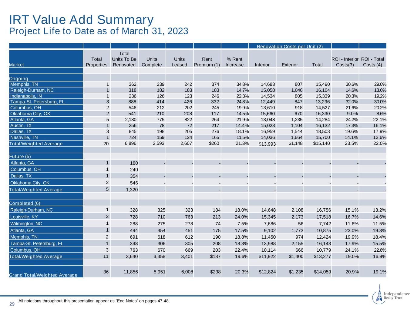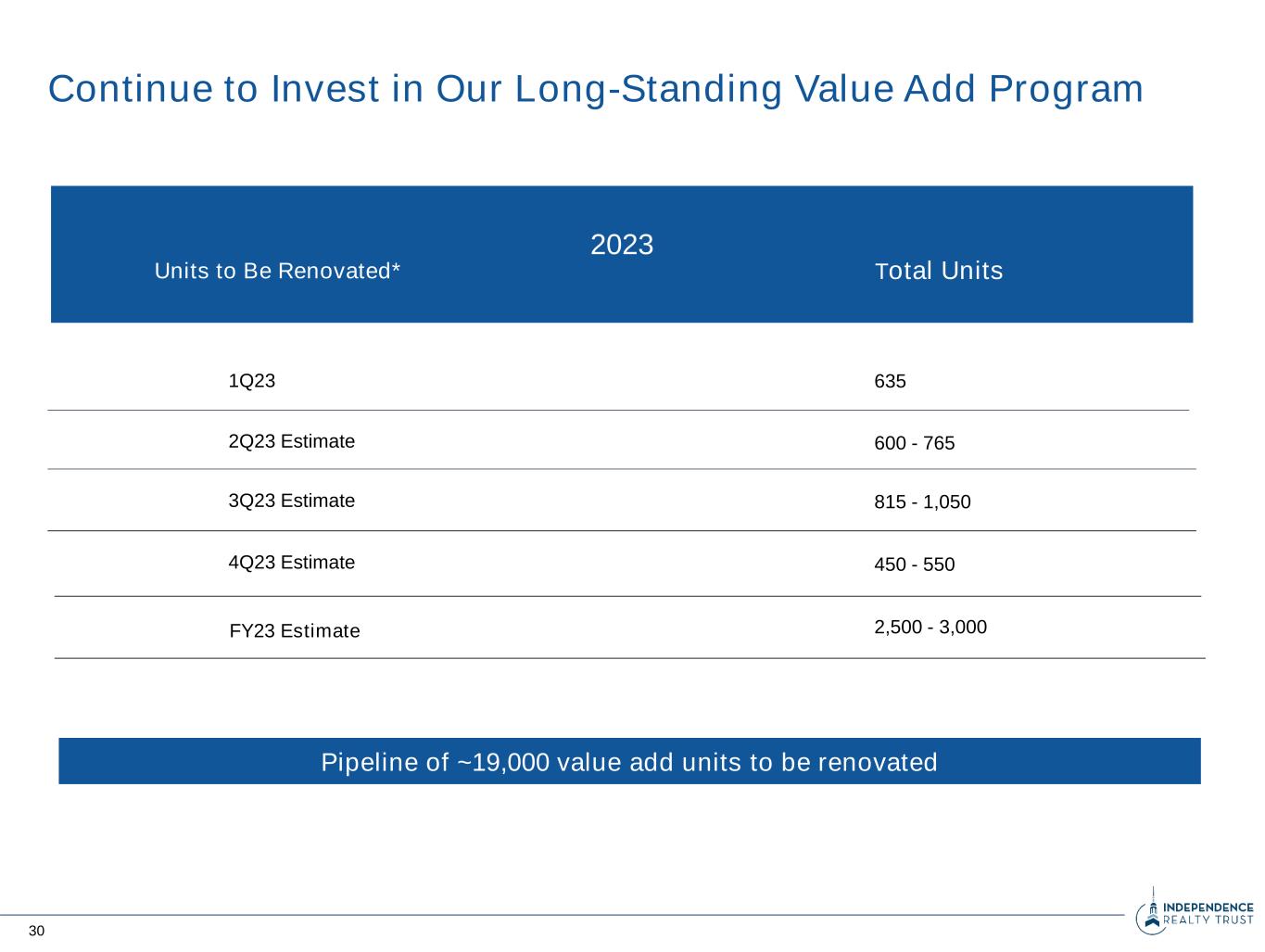 29 IRT增值总结截至2023年3月31日的项目寿命每单位装修成本(2)市场总物业总单位待装修单位完整单位租赁租金溢价(1)%租金增加室内外部总投资回报率-室内成本(3)投资回报率-总成本(4)进行中的孟菲斯,田纳西州136223924237434.8% 14,68380715,49030.6% 29.0%罗利-达勒姆,北卡罗来纳州131818218318314.7% 15,0581,04616,10414.6% 13.6%印第安纳波利斯,印第安纳州123612612324622.3% 14,53480515,33920.3% 19.2%坦帕-圣彼得堡,FL 388841442633224.8% 12,44984713,29632.0% 30.0%俄亥俄州哥伦布254621220224519.9% 13,61091814,52721.6% 20.2%俄克拉荷马城OK 254121020811714.5% 15,66067016,3309.0% 8.6%亚特兰大GA 52,18077582226421.9% 13,0481,23514,28424.2% 22.1%德克萨斯州奥斯汀1256787221714.4% 15,0281,10416,13217.3% 16.1%德克萨斯州达拉斯384519820527618.1% 16,9591,54418,50319.6% 17.9%纳什维尔,TN 172415912416511.5% 14,0361,66415,70014.1% 12.6%合计/加权平均206,8962,5932,607 $ 26021.3% $ 13,993 $ 1,148 $ 15,14023.5% 22.0%未来(5)亚特兰大,GA 1180--------俄亥俄州哥伦布1240 Dallas,TX 1354-------俄克拉何马城,OK 2 546-----------合计/加权平均51,320-----------------------------------------------------------------NC 132832532318418.0% 14,6482,10816,75615.1% 13.2% Louisville,KY 272871076321324.0% 15,3452,17317,51816.7% 14.6% Wilmington,NC 1288275278747.5% 7,686567,74211.6% 11.5% Atlanta,GA 149445445117517.5% 9,1021,77310,87523.0% 19.3% Memphis,TN 269161861219018.8% 11,45097412,42419.9% 18.4% Tampa-St. Petersburg,FL 134830630520818.3% 13,9882,15516,14317.9% 15.5% Columbus,OH 376367066920322.4% 10,11466610,77924.1% 22.6%总计/加权平均113,6403,3583,401 $ 18719.6% $ 11,922 $ 1,400 $ 13,27719.0% 16.9%总计/加权平均3611,8565,9516,008 $ 23820.3% $ 12,824 $ 1,235 $ 14,059 20.9% 19.1%本演示文稿中的所有符号都显示为第47-48页的“结尾注”。