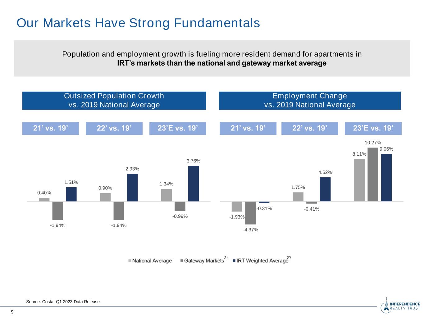 8阳光地带继续受益于积极的移民趋势IRT对上述六个州的敞口约占公司总NOI的60%;这些州在大流行后经历了强劲的就业市场复苏,自2020年3月以来,2022年就业岗位平均增长5%入境迁移率(家庭超过15万户的地区)资料来源:全国房地产经纪人协会,USPS数据国内净人口变化迁移率20222022-2021佛罗里达州+ 318,8551.9%德克萨斯+ 230,9611.6%北卡罗来纳+ 99,7961.3%南卡罗来纳+ 84,0301.7%田纳西+ 81,6461.2%乔治亚+ 81,4061.2%美国人口普查局报告称,佛罗里达、德克萨斯、北卡罗来纳和南卡罗来纳,田纳西州和乔治亚州是2022年国内移民净收益最高的州