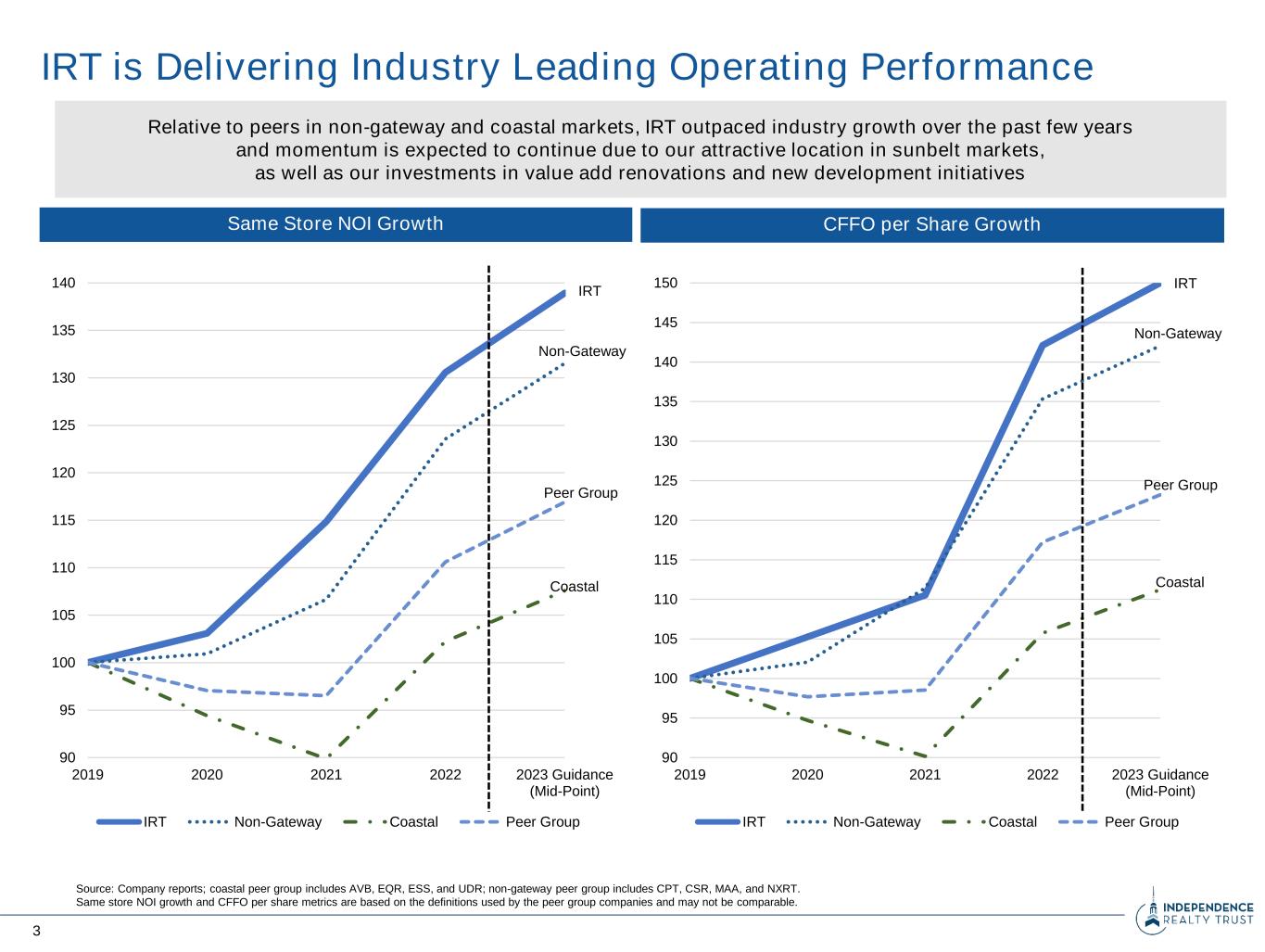 2 IRT概览OWN AND OPERATE Sunbelt Exposure 71% of NOI 119 Communities(2)35,249 Units(2)10.8% 1Q23 Portfolio Average Rental Rate Growth PORTFOLIO SIMMARY(1)SAMME STORE HIGHLIGHIGHTS Q1 2023(5)•收入增长:+ 7.5% Y-o-Y • NOI增长:8.2% Y-o-Y • NOI margin:+ 40bps to 63.3% UPSIDE FROM VALUE ADD • Projects to date a 20.9% unlevered return on interior costs平均租金增长20.3%(6)•可用于增值改造的单位约为19,000个IRT股权市场资本约为39亿美元(4)独立房地产信托(IRT)社区平均社区年龄(2)22岁$ 6.2B总资产FL GAALTX CO OK IL IN OH KY TN SC NC VA PA IRT公司办公室(3)2023指导•同店NOI增长6.5%,核心FFO每股增长5.6%,处于我们指导范围的中点(7)本演示文稿中的所有注释均显示为第47-48页的“结尾注”。