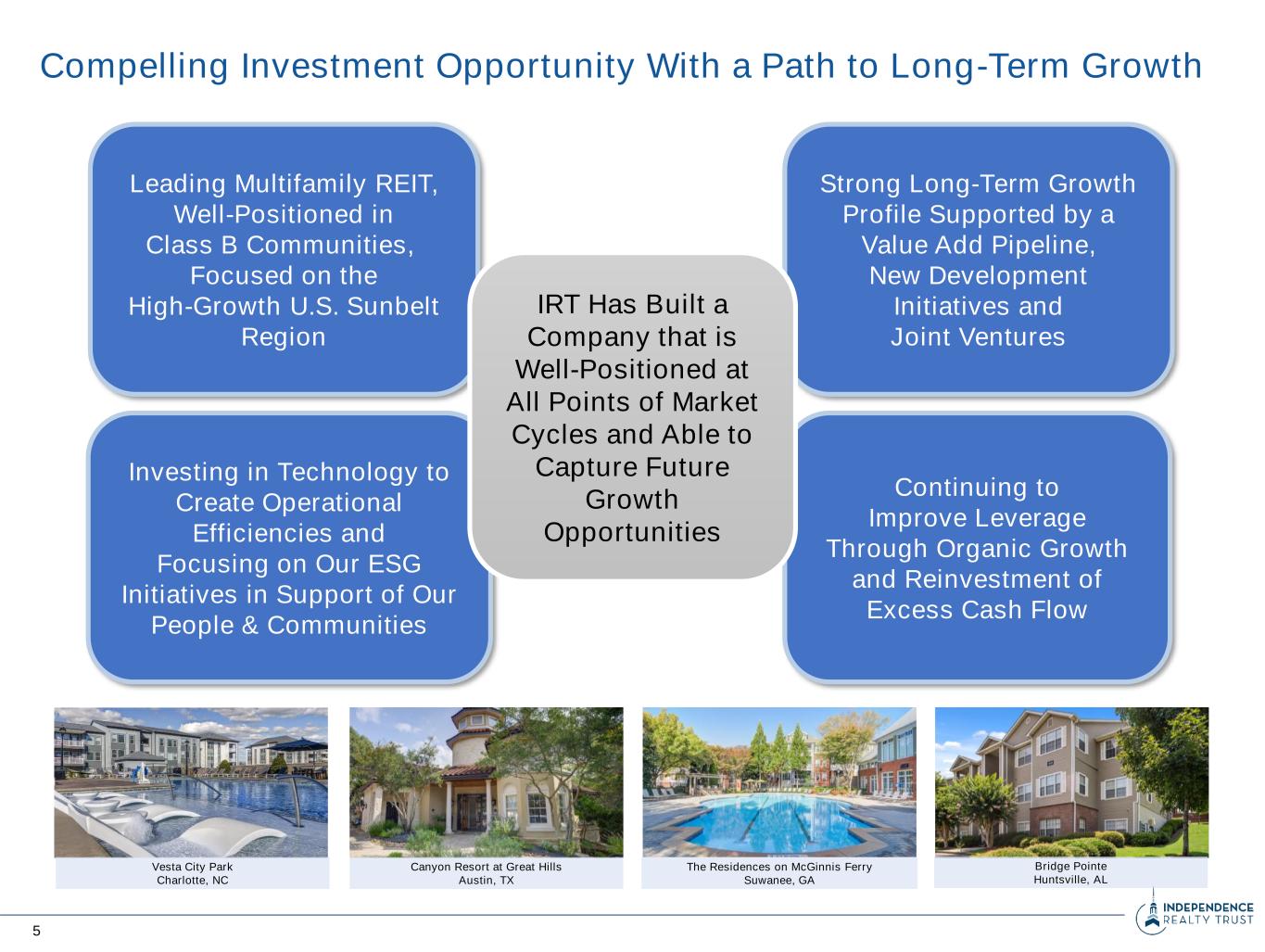 具有长期增长路径的5个令人信服的投资机会乔治亚州麦金尼斯费里苏瓦尼的住宅,领先的多户型房地产投资信托基金,在B类社区中处于有利地位,专注于高增长的美国阳光地带地区,在增值管道、新开发计划和合资企业的支持下,在技术上投资以创造运营效率,并专注于我们的ESG计划,以支持我们的人民和社区继续通过有机增长和超额现金流桥的再投资来提高杠杆,亨茨维尔角,德克萨斯州大山奥斯汀的AL峡谷度假村,维斯塔城市公园夏洛特,NC IRT已经建立了一家在市场周期的各个点都处于有利地位并能够抓住未来增长机会的公司