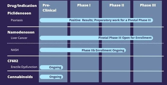 Can-Fite是一家临床阶段的生物制药公司,开发口服生物可利用的小分子治疗产品,用于治疗癌症、肝脏和炎症性疾病以及勃起功能障碍。我们还在开发用于治疗癌症、炎症、自身免疫和代谢性疾病的大麻成分的特定配方。我们的平台技术利用Gi蛋白相关的A3腺苷受体,或A3AR,作为一个治疗目标。A3AR在炎性细胞和癌细胞等病理体细胞中表达较高,在正常细胞中表达较低,表明该受体可能是药物干预的特定靶点。我们的候选药物管道是合成的,高度特异性激动剂和变构调节剂靶向A3AR。