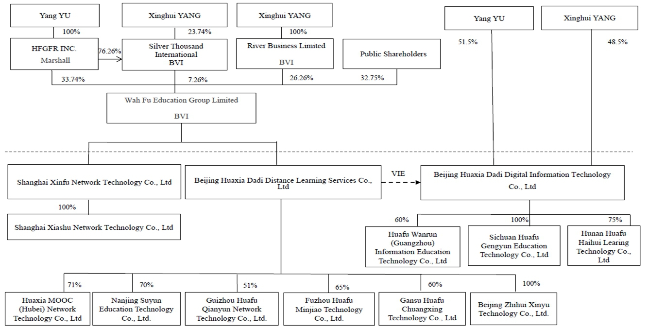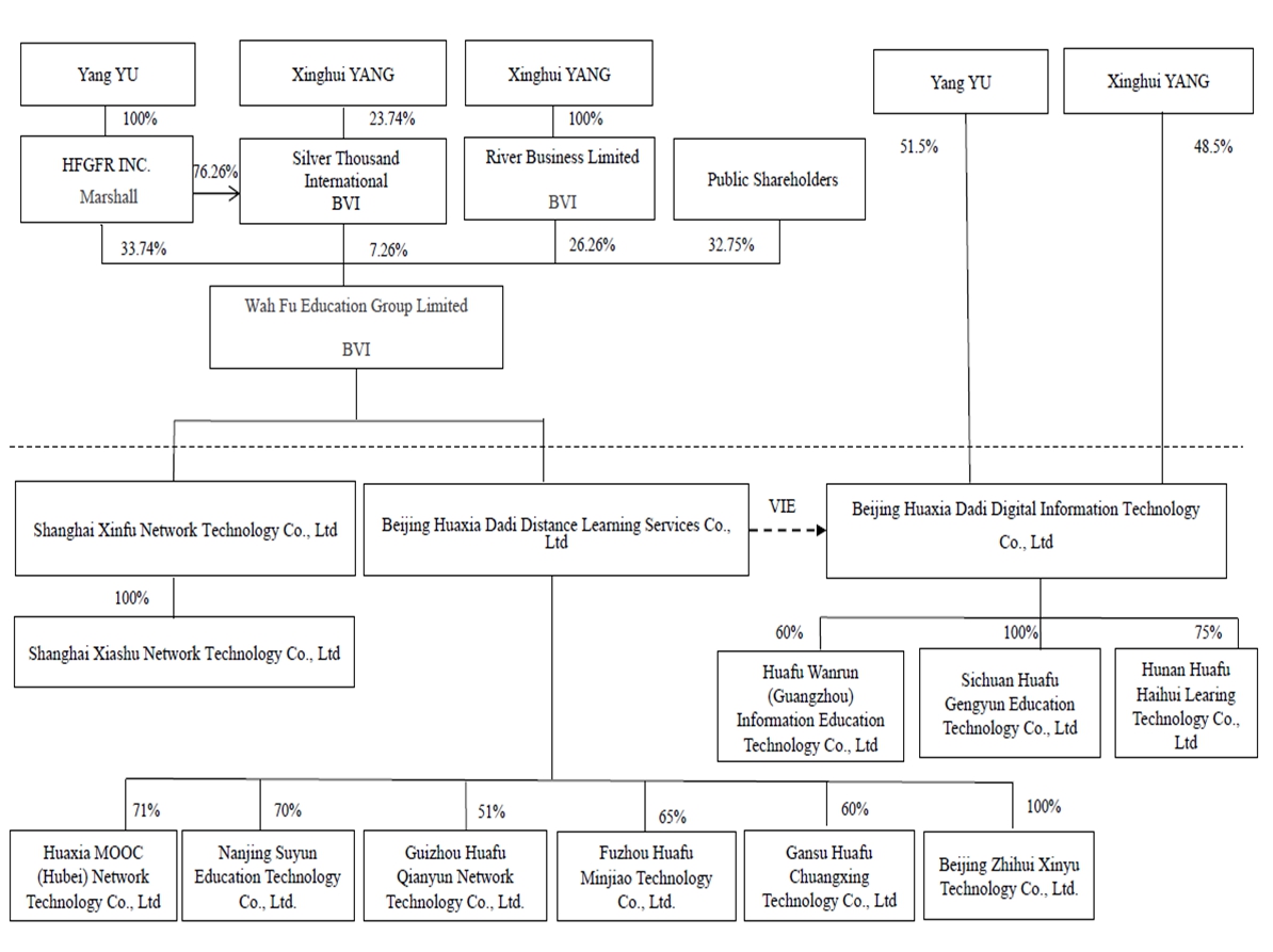 在这份表格20-F的年度报告中,除非另有说明,“华富教育”是指华富教育集团有限公司,一家在英属维尔京群岛(“BVI”)组建的公司;“我们”、“我们”、“我们的”、“我们的”、“我们的公司”、“公司”或类似词语指华富教育集团有限公司及/或其合并附属公司,但可变利益实体北京华夏大地数字信息技术有限公司(一家中国公司)及北京华夏大地数字信息技术有限公司–山东分公司(北京华夏大地数字信息技术有限公司的分公司)除外,除非文意另有所指;及“VIE”分别指可变利益实体及其附属公司北京华夏大地数字信息技术有限公司及其附属公司,如华富万润(广州)教育科技、四川华富耕云教育科技有限公司,和湖南华孚海汇学习科技有限公司华富教育主要通过其外商独资企业(“WFOE”)及其直接拥有的子公司,并通过与中国境内VIE的合同安排在中国开展业务。由此,华富教育不自行开展任何业务。为了会计目的,VIE及其子公司的财务业绩被合并到我们的财务报表中,但我们没有持有VIE或其任何子公司的任何股权。投资者正在购买英属维尔京群岛控股公司华富教育的权益。