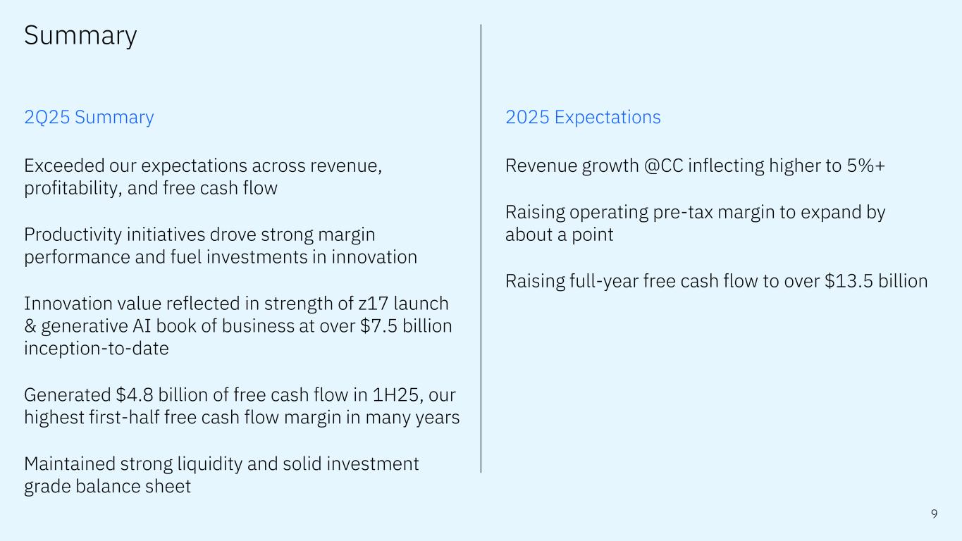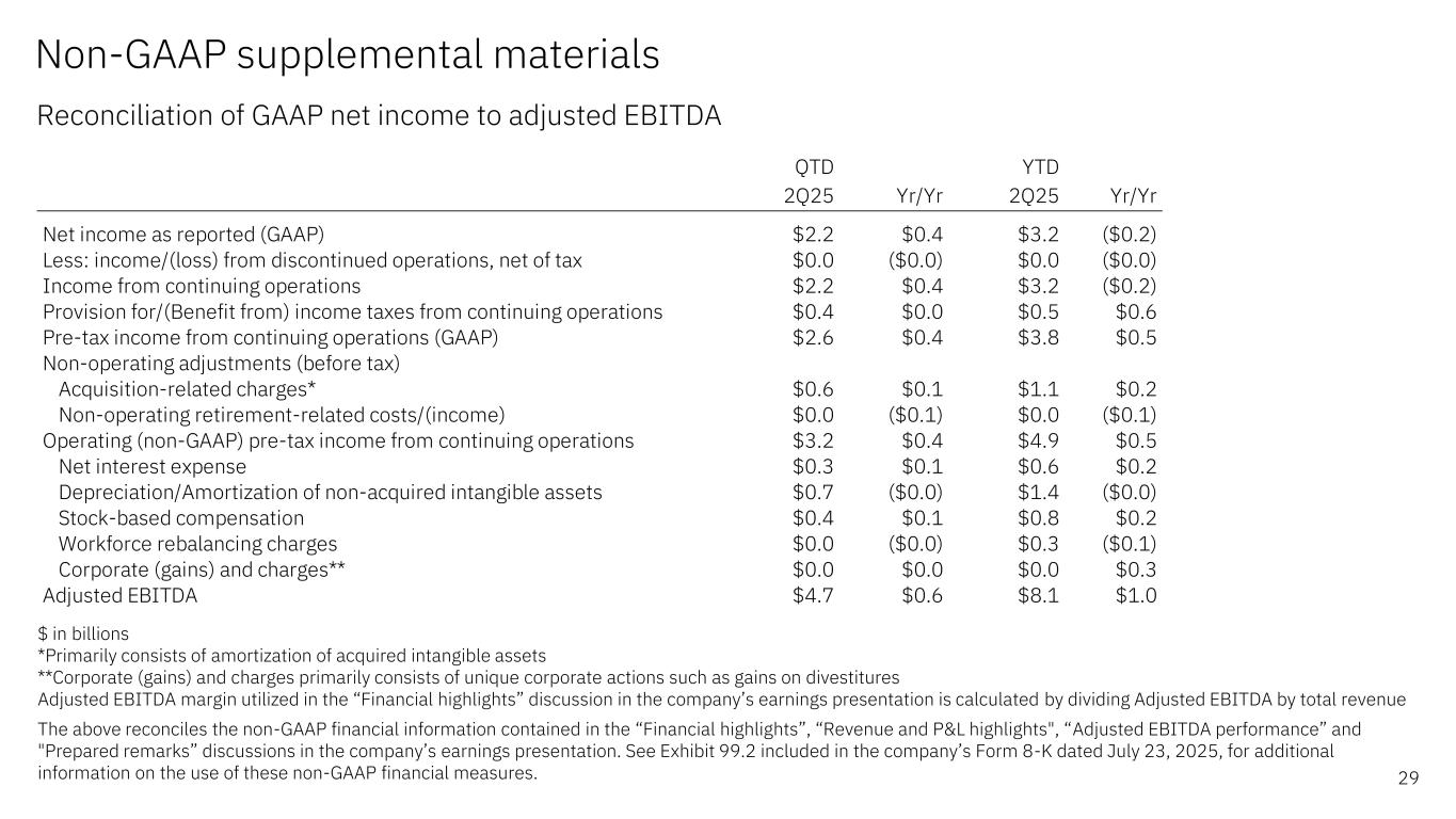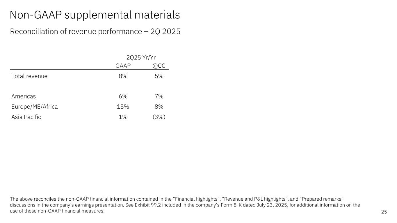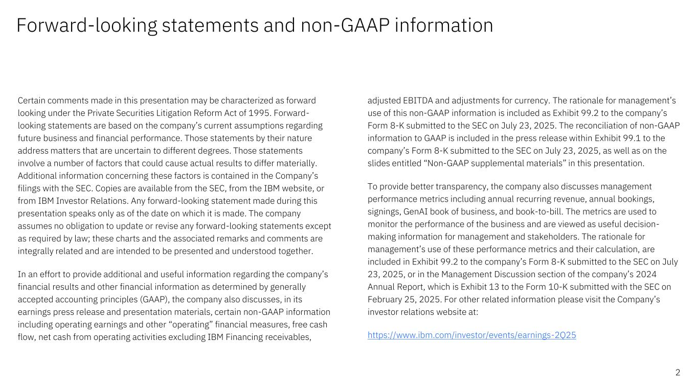 前瞻性陈述和非GAAP信息根据1995年《私人证券诉讼改革法案》,本演示文稿中的某些评论可能被定性为前瞻性。前瞻性陈述是基于公司目前对未来业务和财务业绩的假设。这些声明本质上涉及不同程度不确定的问题。这些陈述涉及许多因素,可能导致实际结果出现重大差异。有关这些因素的更多信息包含在该公司提交给SEC的文件中。副本可从SEC、IBM网站或IBM投资者关系部获得。本演示文稿期间所做的任何前瞻性陈述仅代表其发表之日的情况。除法律要求外,公司不承担更新或修改任何前瞻性陈述的义务;这些图表以及相关的评论和评论是完整相关的,旨在一起呈现和理解。为了努力提供有关该公司财务业绩和其他根据公认会计原则(GAAP)确定的财务信息的额外有用信息,该公司还在其收益新闻稿和演示材料中讨论了某些非GAAP信息,包括营业收入和其他“经营”财务指标、自由现金流、经营活动产生的净现金(不包括IBM应收融资款)、调整后的EBITDA和货币调整。管理层使用这些非GAAP信息的理由作为附件 99.2包含在该公司于2025年7月23日提交给SEC的8-K表格中。非GAAP信息与GAAP的对账情况包含在公司于2025年7月23日提交给SEC的8-K表格的附件 99.1中的新闻稿中,以及本演示文稿中题为“非GAAP补充材料”的幻灯片中。为了提供更好的透明度,该公司还讨论了管理绩效指标,包括年度经常性收入、年度预订、签约、GenAI业务账簿和订单到账单。这些指标用于监测业务绩效,并被视为对管理层和利益相关者有用的决策信息。管理层使用这些绩效指标及其计算的理由,包含在公司于2025年7月23日提交给SEC的8-K表格的附件 99.2中,或公司2024年年度报告的管理层讨论部分,这是2025年2月25日提交给SEC的10-K表格的附件 13。其他相关信息请访问公司投资者关系网站:https://www.ibm.com/investor/events/earnings-2Q25 2