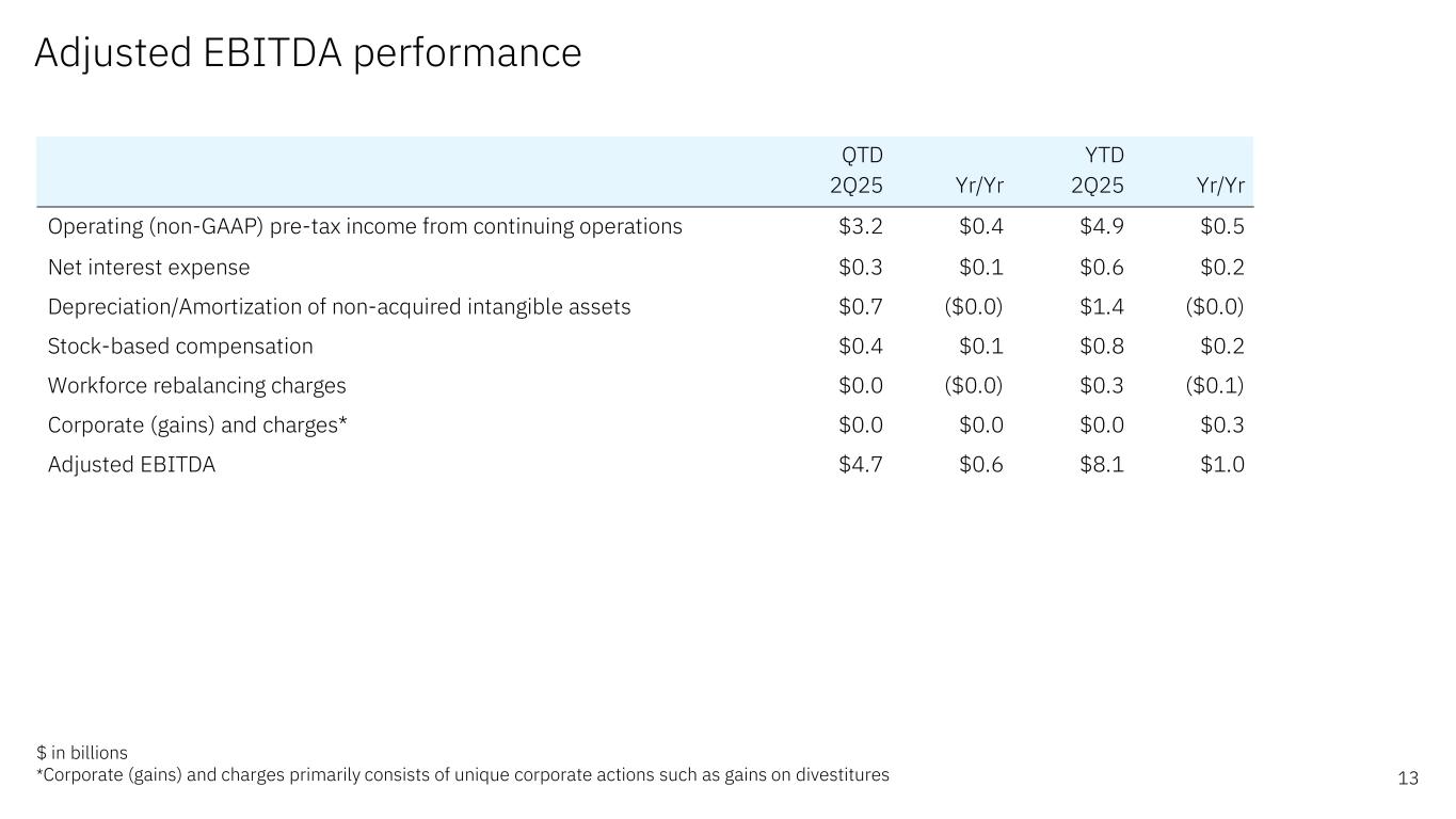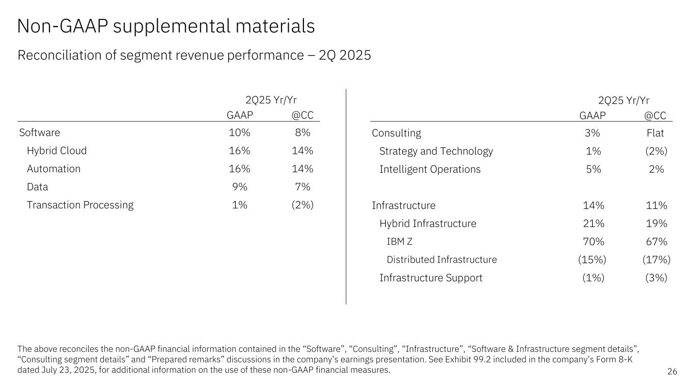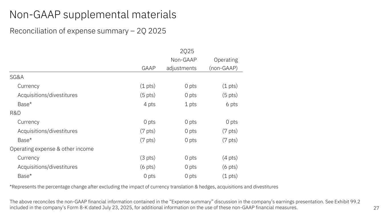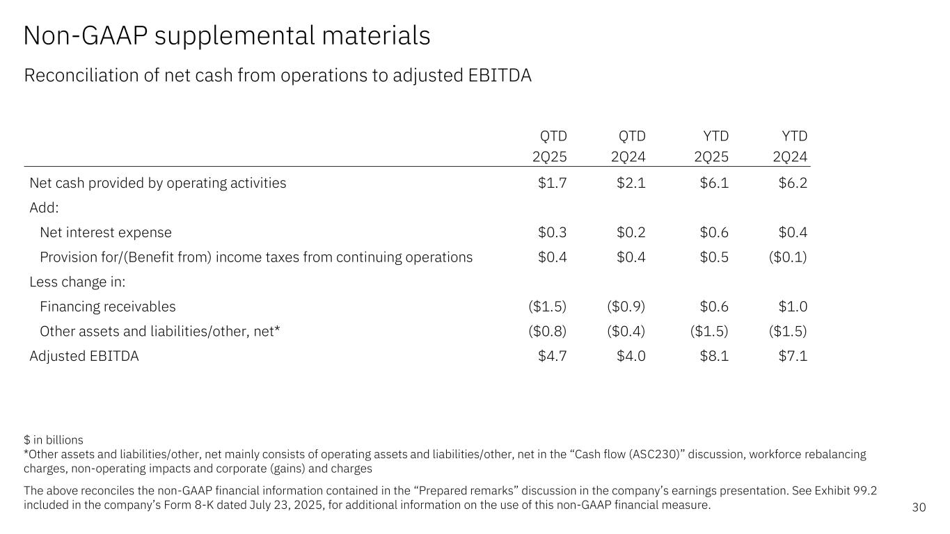 前瞻性陈述和非GAAP信息根据1995年《私人证券诉讼改革法案》,本演示文稿中的某些评论可能被定性为前瞻性。前瞻性陈述是基于公司目前对未来业务和财务业绩的假设。这些声明本质上涉及不同程度不确定的问题。这些陈述涉及许多因素,可能导致实际结果出现重大差异。有关这些因素的更多信息包含在该公司提交给SEC的文件中。副本可从SEC、IBM网站或IBM投资者关系部获得。本演示文稿期间所做的任何前瞻性陈述仅代表其发表之日的情况。除法律要求外,公司不承担更新或修改任何前瞻性陈述的义务;这些图表以及相关的评论和评论是完整相关的,旨在一起呈现和理解。为了努力提供有关该公司财务业绩和其他根据公认会计原则(GAAP)确定的财务信息的额外有用信息,该公司还在其收益新闻稿和演示材料中讨论了某些非GAAP信息,包括营业收入和其他“经营”财务指标、自由现金流、经营活动产生的净现金(不包括IBM应收融资款)、调整后的EBITDA和货币调整。管理层使用这些非GAAP信息的理由作为附件 99.2包含在该公司于2025年7月23日提交给SEC的8-K表格中。非GAAP信息与GAAP的对账情况包含在公司于2025年7月23日提交给SEC的8-K表格的附件 99.1中的新闻稿中,以及本演示文稿中题为“非GAAP补充材料”的幻灯片中。为了提供更好的透明度,该公司还讨论了管理绩效指标,包括年度经常性收入、年度预订、签约、GenAI业务账簿和订单到账单。这些指标用于监测业务绩效,并被视为对管理层和利益相关者有用的决策信息。管理层使用这些绩效指标及其计算的理由,包含在公司于2025年7月23日提交给SEC的8-K表格的附件 99.2中,或公司2024年年度报告的管理层讨论部分,这是2025年2月25日提交给SEC的10-K表格的附件 13。其他相关信息请访问公司投资者关系网站:https://www.ibm.com/investor/events/earnings-2Q25 2