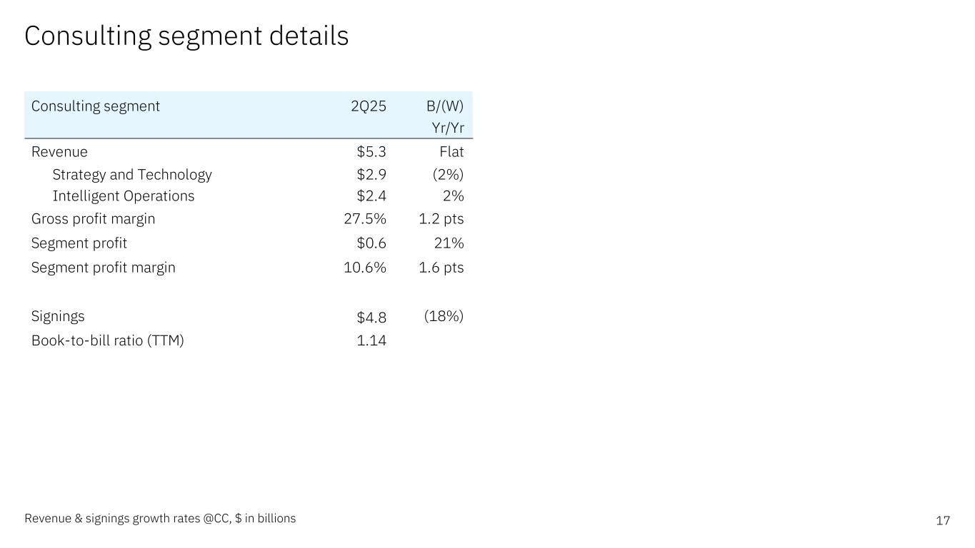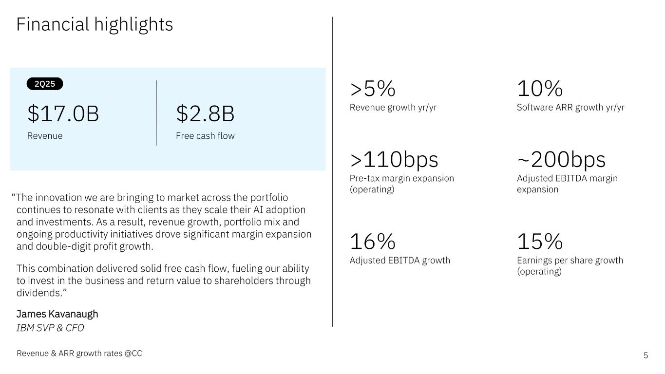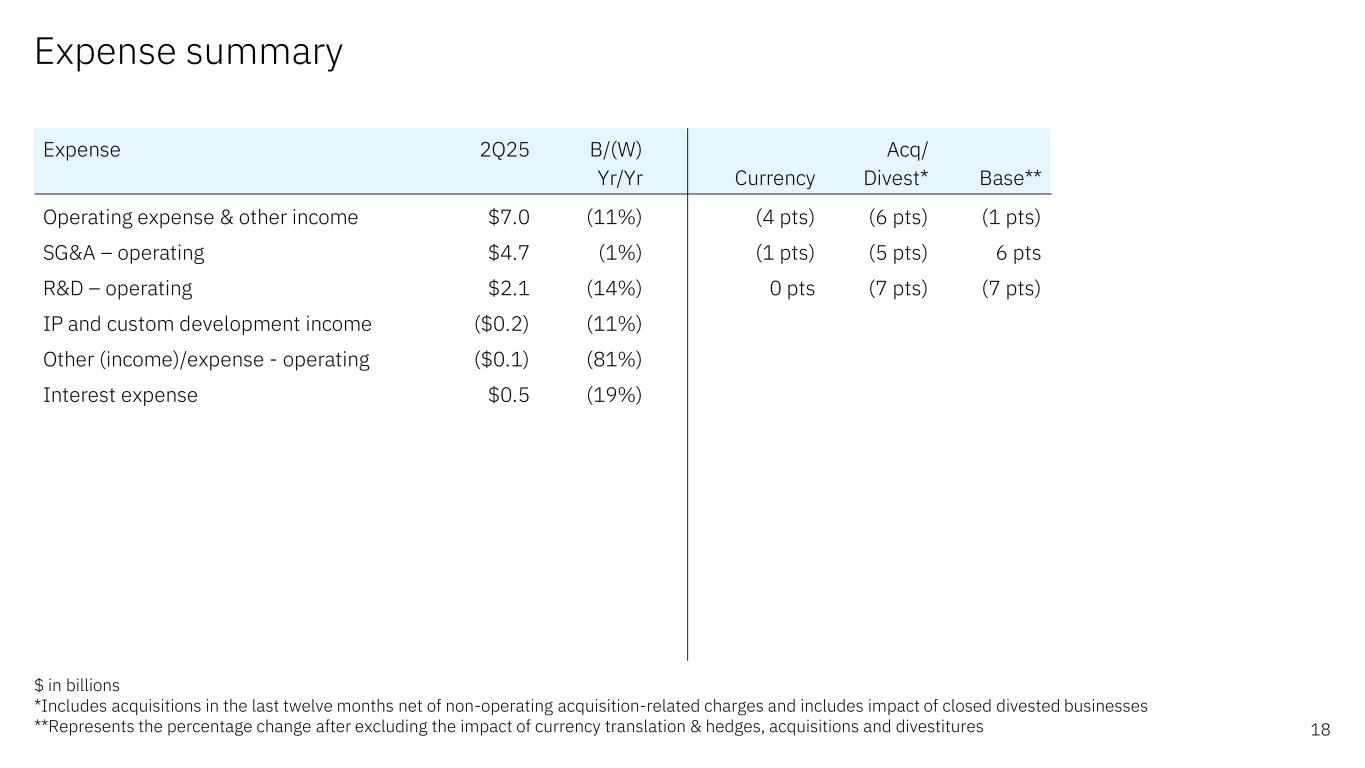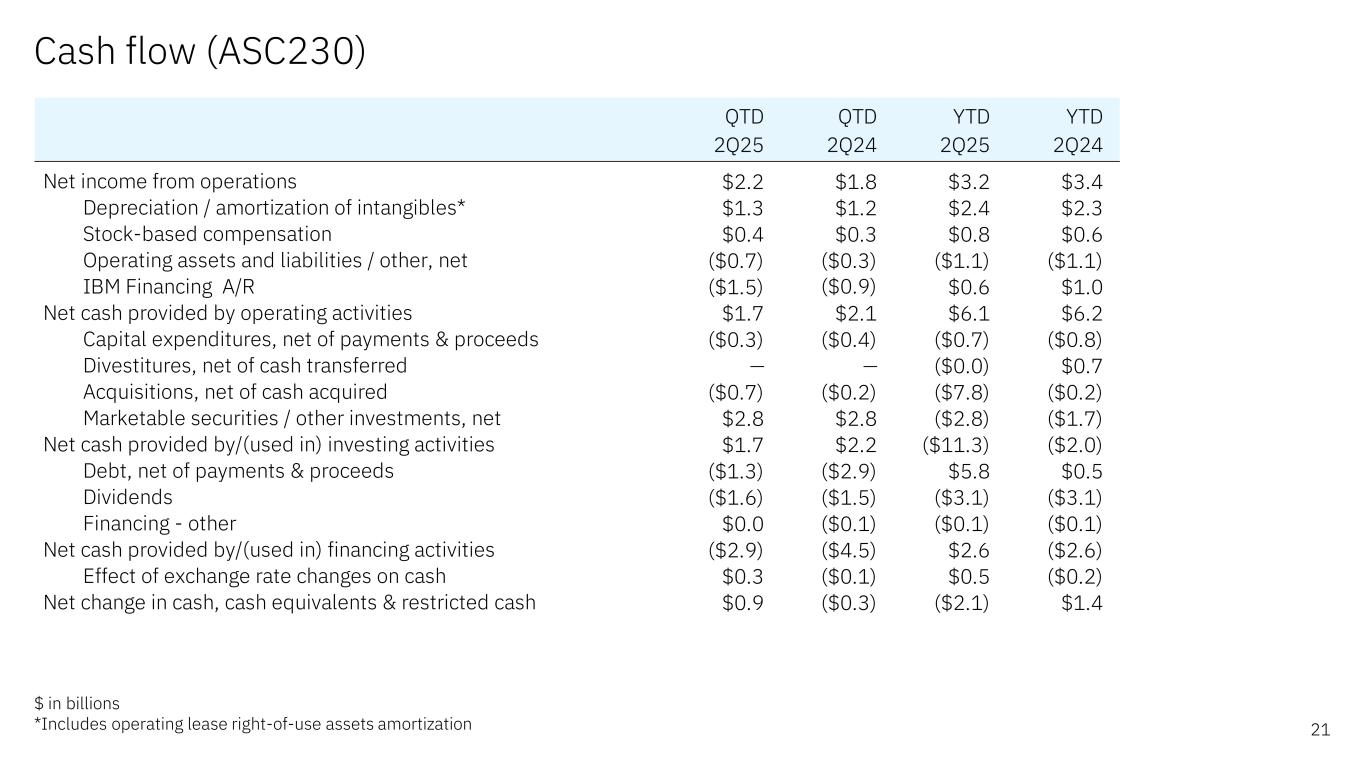前瞻性陈述和非GAAP信息根据1995年《私人证券诉讼改革法案》,本演示文稿中的某些评论可能被定性为前瞻性。前瞻性陈述是基于公司目前对未来业务和财务业绩的假设。这些声明本质上涉及不同程度不确定的问题。这些陈述涉及许多因素,可能导致实际结果出现重大差异。有关这些因素的更多信息包含在该公司提交给SEC的文件中。副本可从SEC、IBM网站或IBM投资者关系部获得。本演示文稿期间所做的任何前瞻性陈述仅代表其发表之日的情况。除法律要求外,公司不承担更新或修改任何前瞻性陈述的义务;这些图表以及相关的评论和评论是完整相关的,旨在一起呈现和理解。为了努力提供有关该公司财务业绩和其他根据公认会计原则(GAAP)确定的财务信息的额外有用信息,该公司还在其收益新闻稿和演示材料中讨论了某些非GAAP信息,包括营业收入和其他“经营”财务指标、自由现金流、经营活动产生的净现金(不包括IBM应收融资款)、调整后的EBITDA和货币调整。管理层使用这些非GAAP信息的理由作为附件 99.2包含在该公司于2025年7月23日提交给SEC的8-K表格中。非GAAP信息与GAAP的对账情况包含在公司于2025年7月23日提交给SEC的8-K表格的附件 99.1中的新闻稿中,以及本演示文稿中题为“非GAAP补充材料”的幻灯片中。为了提供更好的透明度,该公司还讨论了管理绩效指标,包括年度经常性收入、年度预订、签约、GenAI业务账簿和订单到账单。这些指标用于监测业务绩效,并被视为对管理层和利益相关者有用的决策信息。管理层使用这些绩效指标及其计算的理由,包含在公司于2025年7月23日提交给SEC的8-K表格的附件 99.2中,或公司2024年年度报告的管理层讨论部分,这是2025年2月25日提交给SEC的10-K表格的附件 13。其他相关信息请访问公司投资者关系网站:https://www.ibm.com/investor/events/earnings-2Q25 2