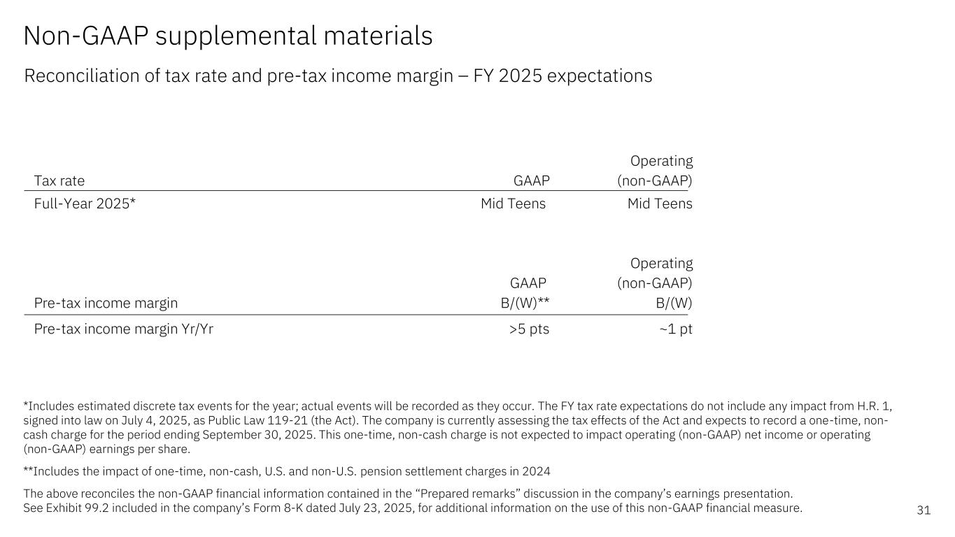 Non-GAAP补充材料税率和税前利润率的调节– 2025财年预期*包括当年估计的离散税务事件;实际事件将在发生时记录。财政年度税率预期不包括H.R. 1的任何影响,该法案于2025年7月4日签署成为法律,为公法119-21(法案)。该公司目前正在评估该法案的税收影响,预计将在截至2025年9月30日的期间记录一次性非现金费用。这一一次性、非现金费用预计不会影响运营(非美国通用会计准则)净收入或运营(非美国通用会计准则)每股收益。**包括2024年一次性、非现金、美国和非美国养老金结算费用的影响。上述对公司收益报告中“准备好的评论”讨论中包含的非GAAP财务信息进行了核对。有关使用这一非公认会计原则财务指标的更多信息,请参见公司2025年7月23日的8-K表格中包含的附件 99.2。31税率GAAP运营(非GAAP)2025年全年*Mid Teens Mid Teens GAAP Operating(non-GAAP)税前利润率B/(W)**B/(W)税前利润率yr/yr > 5 pts~1 pt
