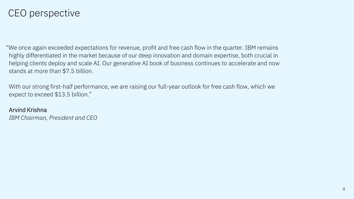 “我们在本季度的收入、利润和自由现金流方面再次超出预期。由于我们深厚的创新能力和领域专长,IBM在市场上保持着高度差异化,这两项在帮助客户部署和扩展人工智能方面都至关重要。我们的生成AI业务账簿继续加速,目前已超过75亿美元。凭借上半年的强劲表现,我们正在上调自由现金流的全年预期,我们预计该预期将超过135亿美元。”Arvind KrishnaIBM董事长、总裁兼首席执行官4CEO透视