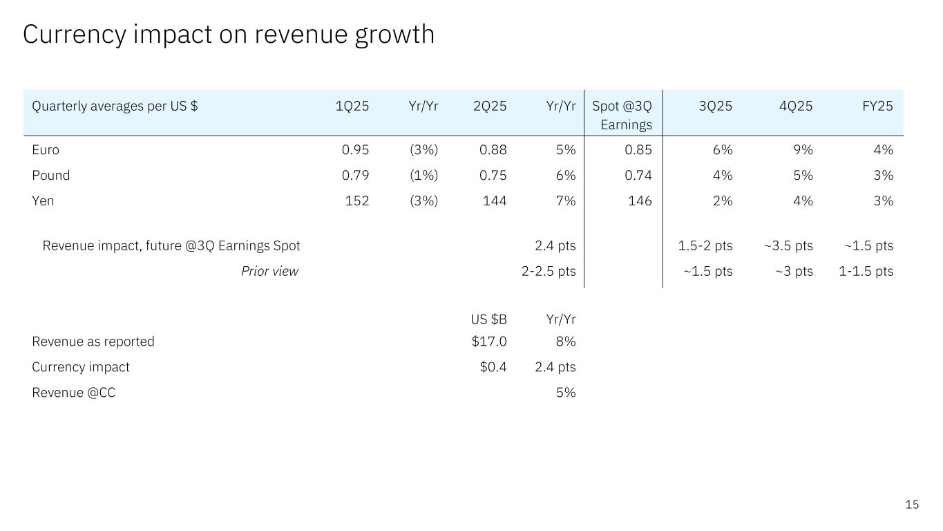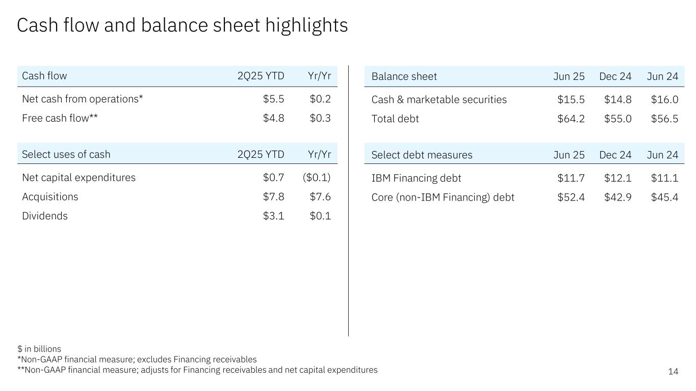 现金流和资产负债表凸显14十亿美元*非GAAP财务指标;不包括应收融资款**Non-GAAP财务计量;应收融资调整和净资本支出现金流2Q25 YTD yr/yr来自运营的净现金*$ 5.5 $ 0.2自由现金流**$ 4.8 $ 0.3选择使用现金2Q25 YTD YR/YR净资本支出$ 0.7($ 0.1)收购$ 7.8 $ 7.6股息$ 3.1 $ 0.1资产负债表Jun 25 Dec 24 Jun 24 Cash & Marketable Securities $ 15.5 $ 14.8 $ 16.0总债务$ 64.2 $ 55.0 $ 56.5选择债务计量Jun 25 Dec 24 Jun 24 IBM融资债务$ 11.7 $ 12.1 $ 11.1核心(非IBM融资)债务$ 52.4 $ 42.9 $ 45.4