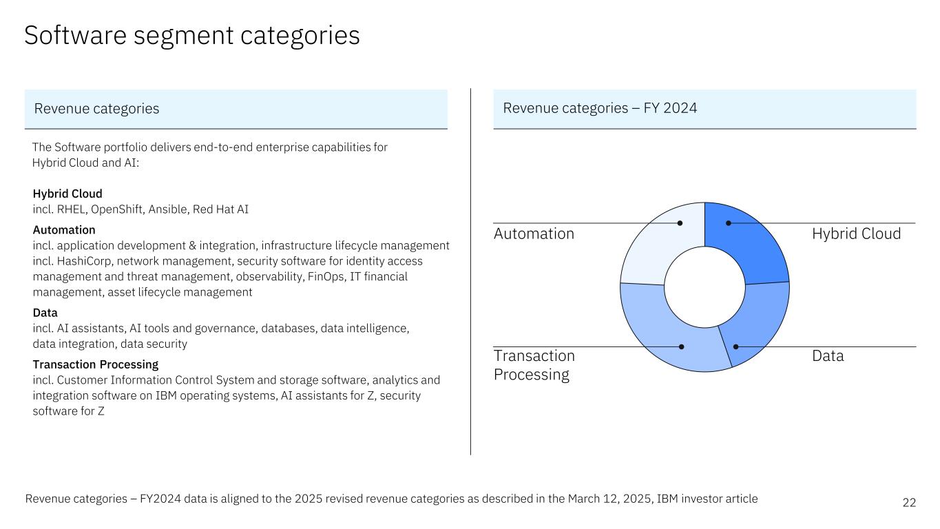 软件部门类别收入类别– 2024财年收入类别22软件组合为混合云和人工智能提供端到端的企业能力:混合云包括。RHEL、OpenShift、Ansible、红帽 AI自动化包括应用开发与集成、基础设施生命周期管理包括HashiCorp,网络管理,用于身份访问管理和威胁管理的安全软件,可观察性,FinOps,IT财务管理,资产生命周期管理数据包括。AI助手、AI工具和治理、数据库、数据智能、数据集成、数据安全事务处理包括。客户信息控制系统和存储软件、IBM操作系统上的分析和集成软件、面向Z的AI助手、面向Z混合云事务处理数据自动化收入类别的安全软件– 2024财年数据与2025年3月12日所述的2025年修订后收入类别保持一致,IBM投资者文章