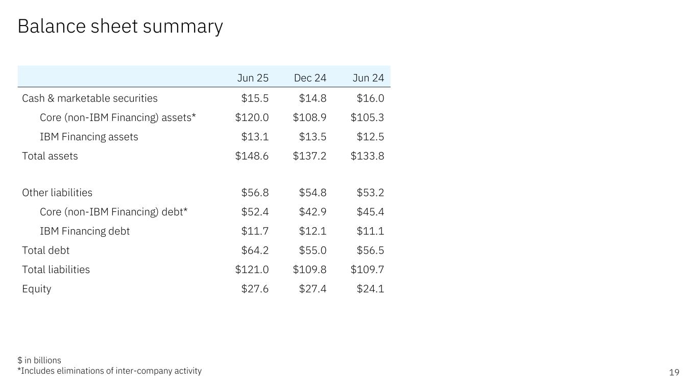 资产负债表摘要19十亿美元*包括冲销公司间活动6月25日12月24日6月24日现金和有价证券15.5美元14.8美元16.0美元核心(非IBM融资)资产*$ 120.0 $ 108.9 $ 105.3 IBM融资资产$ 13.1 $ 13.5 $ 12.5总资产$ 148.6 $ 137.2 $ 133.8其他负债$ 56.8 $ 54.8 $ 53.2核心(非IBM融资)债务*$ 52.4 $ 42.9 $ 45.4 IBM融资债务$ 11.7 $ 12.1 $ 11.1总债务$ 64.2 $ 55.0 $ 56.5总负债$ 121.0 $ 109.8 $ 109.7权益$ 27.6 $ 27.4 $ 24.1