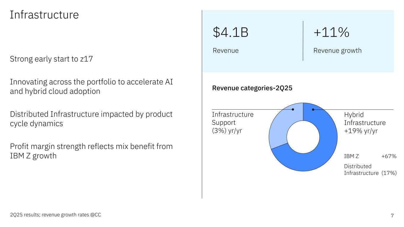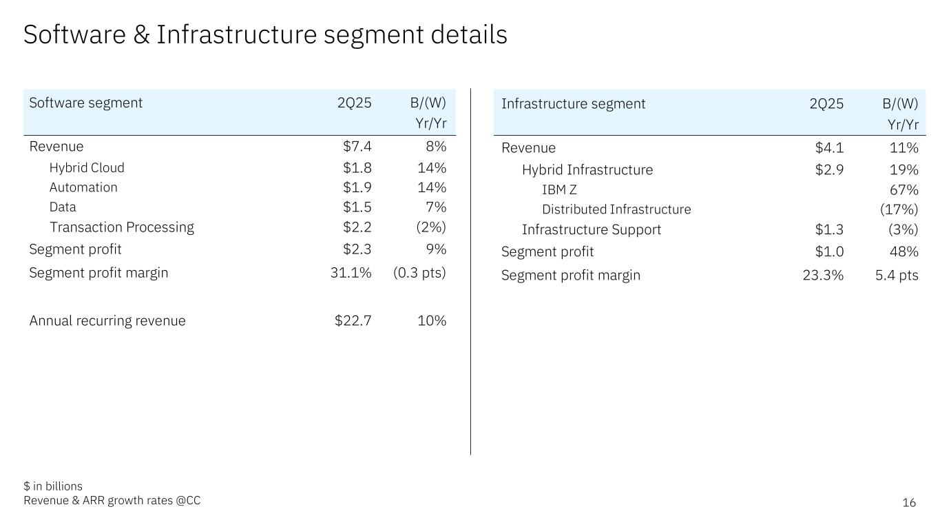 软件和基础设施部门详细介绍了16个数十亿美元的收入& ARR增长率@ CC基础设施部门2Q25 B/(W)YR/YR收入$ 4.111%混合基础设施$ 2.919% IBM Z 67%分布式基础设施(17%)基础设施支持$ 1.3(3%)部门利润$ 1.048%部门利润率23.3% 5.4pts软件部门2Q25 B/(W)YR/YR收入$ 7.48%混合云$ 1.814%自动化$ 1.914%数据$ 1.57%事务处理$ 2.2(2%)部门利润$ 2.39%部门利润率31.1%(0.3pts)年度经常性收入$ 22.7 10%