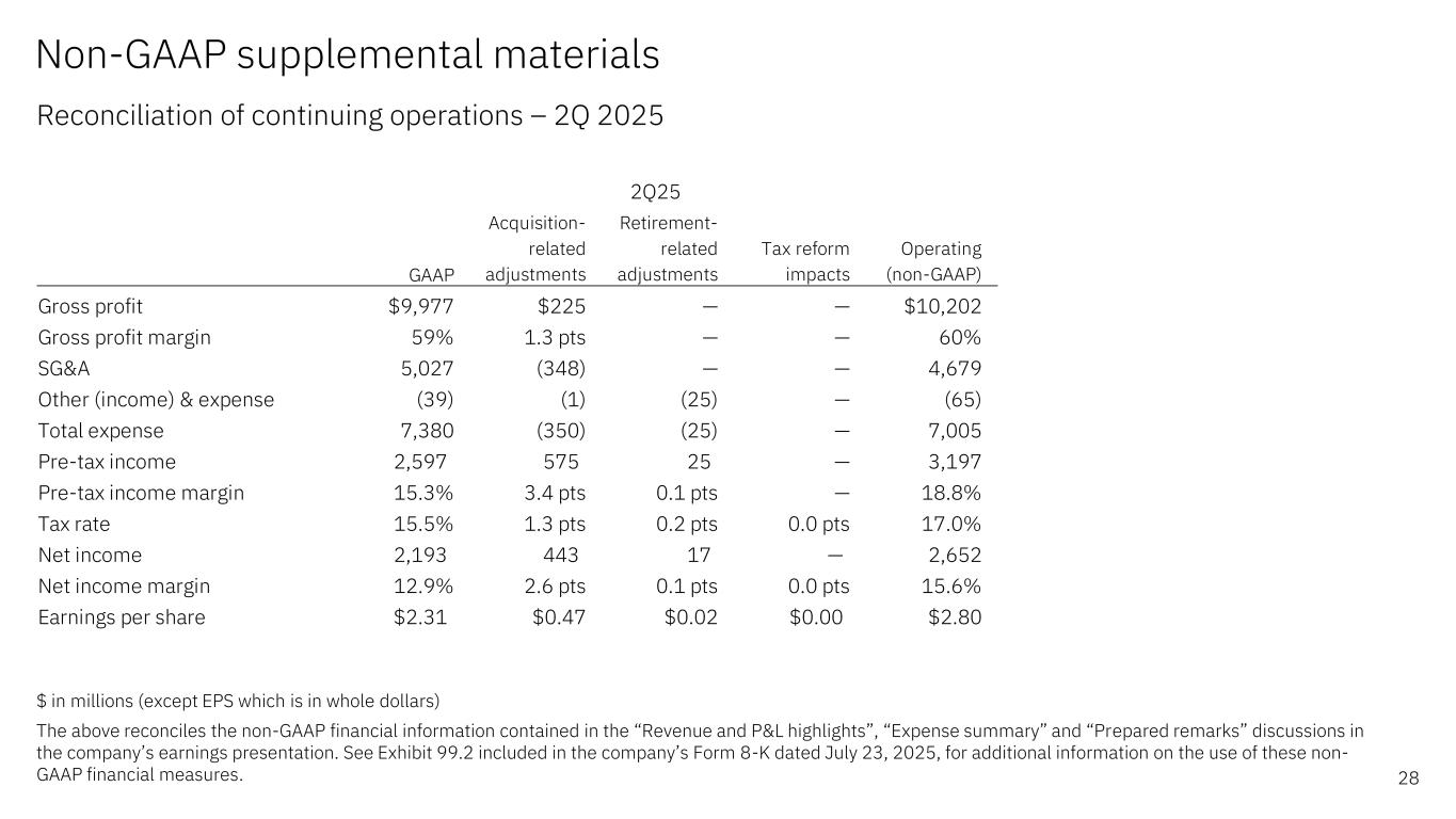 Non-GAAP补充材料调节持续经营业务– 2025年第二季度28百万美元(EPS以美元计除外)上述调节了公司收益报告中“收入和损益要点”、“费用摘要”和“准备好的评论”讨论中包含的非GAAP财务信息。有关使用这些非公认会计准则财务指标的更多信息,请参见公司2025年7月23日的8-K表格中包含的附件 99.2。GAAP收购相关调整退休相关调整税改影响营业(非GAAP)毛利润$ 9,977 $ 225 —— $ 10,202毛利率59% 1.3pts —— 60% SG & A 5,027(348)—— 4,679其他(收入)和费用(39)(1)(25)——(65)总费用7,380(350)(25)— 7,005税前收入2,59757525 — 3,197税前利润率15.3% 3.4pts 0.1pts — 18.8%税率15.5% 1.3pts 0.2pts 0.0 pts 17.0%净利润2,19344317 — 2,652净利润率12.9% 2.6pts 0.1pts 0.0 pts 15.6%每股收益2.31美元$ 0.47 $ 0.02 $ 0.00 $ 2.80 2Q25