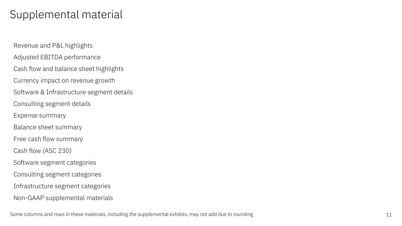 补充材料11这些材料中的某些列和行,包括补充展品,由于四舍五入,可能不会增加收入和损益亮点调整后EBITDA业绩现金流和资产负债表亮点货币对收入增长的影响软件和基础设施分部详情咨询分部详情费用摘要资产负债表摘要自由现金流摘要现金流(ASC 230)软件分部类别咨询分部类别基础设施分部类别非公认会计准则补充材料