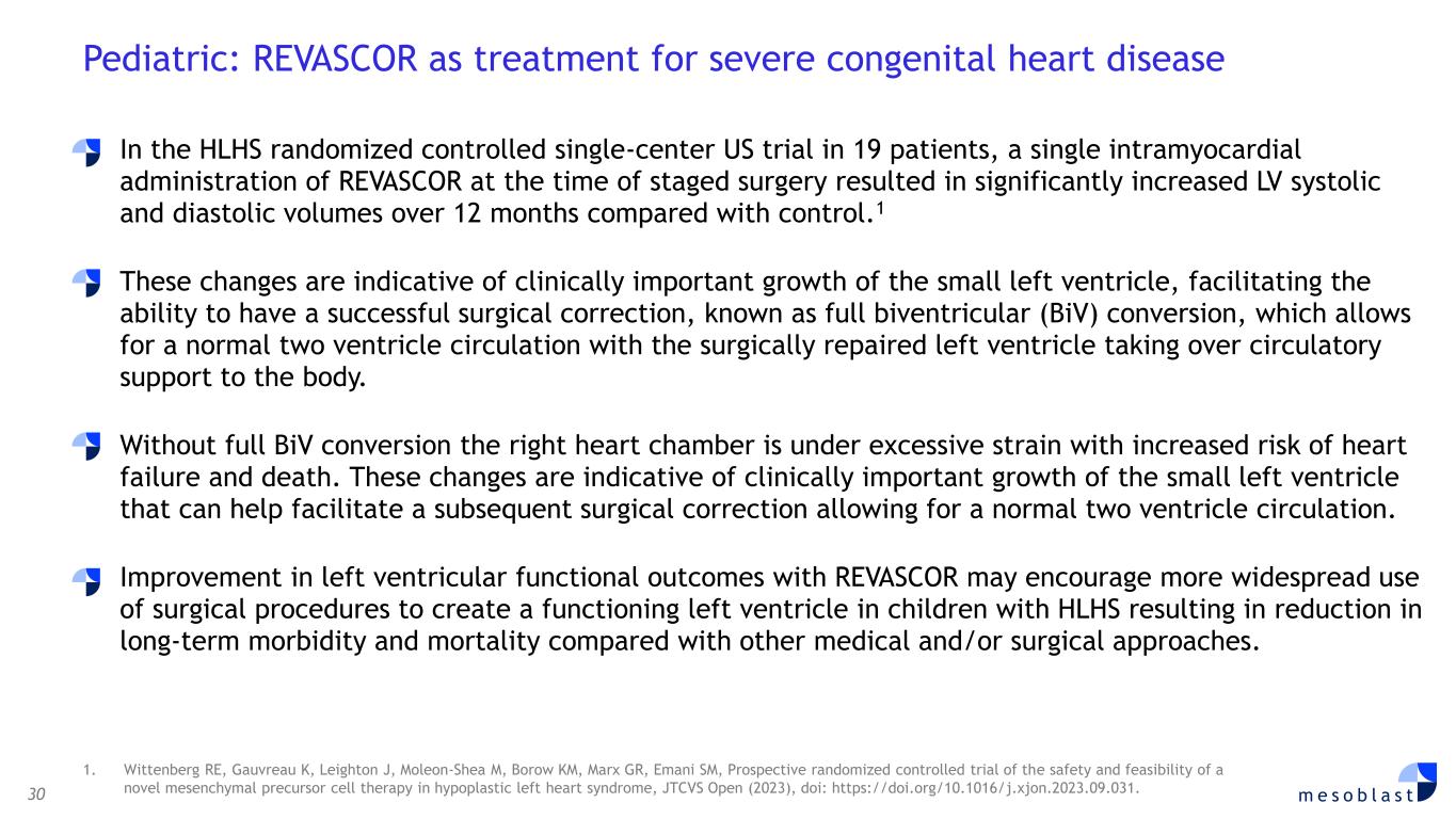 30m e s o b l a s t在19名患者的HLHS随机对照单中心美国试验中,在分期手术时单次心肌内给药REVASCOR导致与对照相比在12个月内LV收缩和舒张容积显着增加。1这些变化表明小左心室的临床重要生长,促进了成功的手术矫正能力,称为全双心室(BiV)转换,这允许正常的两心室循环,手术修复的左心室接管对身体的循环支持。如果没有完全的BiV转换,右心腔承受过度的压力,导致心力衰竭和死亡的风险增加。这些变化表明小左心室有临床上重要的生长,有助于促进随后的手术矫正,允许正常的两室循环。REVASCOR改善左心室功能结局可能会鼓励更广泛地使用外科手术,以在HLHS患儿中创建一个功能正常的左心室,从而与其他医疗和/或手术方法相比降低长期发病率和死亡率。儿科:REVASCOR用于治疗严重先天性心脏病1。Wittenberg RE,Gauvreau K,Leighton J,Moleon-Shea M,Borow KM,Marx GR,Emani SM,新型间充质前体细胞疗法治疗发育不良左心综合征的安全性和可行性的前瞻性随机对照试验,JTCVS Open(2023),doi:https://doi.org/10.1016/j.xjon.2023.09.031。