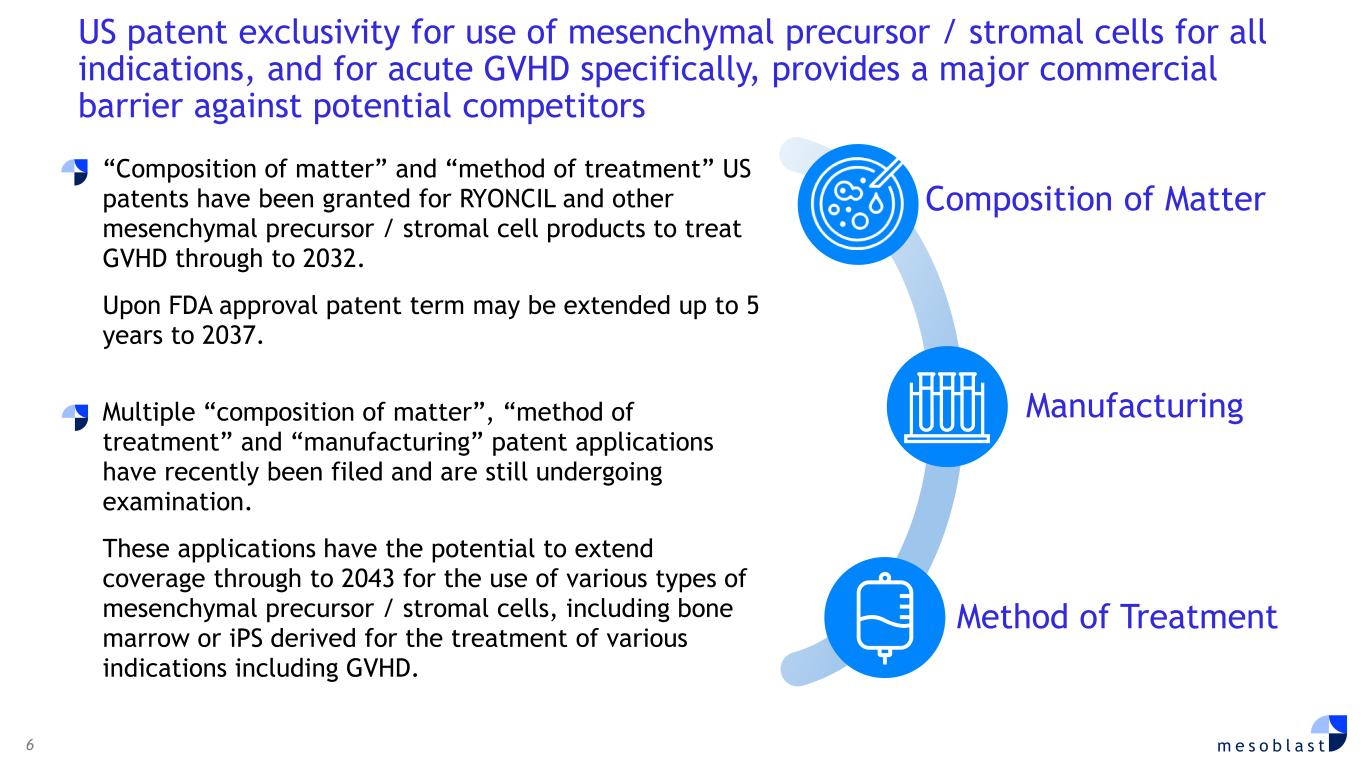 6 m e s o b l a s t美国专利独占权,用于将间充质前体/基质细胞用于所有适应症,特别是用于急性GVHD,为对抗潜在竞争对手提供了主要的商业壁垒,制造治疗物质组成的方法“物质组成”和“治疗方法”美国专利已被授予RYONCIL和其他间充质前体/基质细胞产品治疗GVHD直至2032年。经FDA批准,专利期限最长可延长5年至2037年。多个“物质的组成”、“处理方法”和“制造”专利申请近期被立案,目前仍在审查中。这些应用有可能将覆盖范围扩大到2043年,用于使用各种类型的间充质前体/基质细胞,包括骨髓或用于治疗包括GVHD在内的各种适应症的iPS。