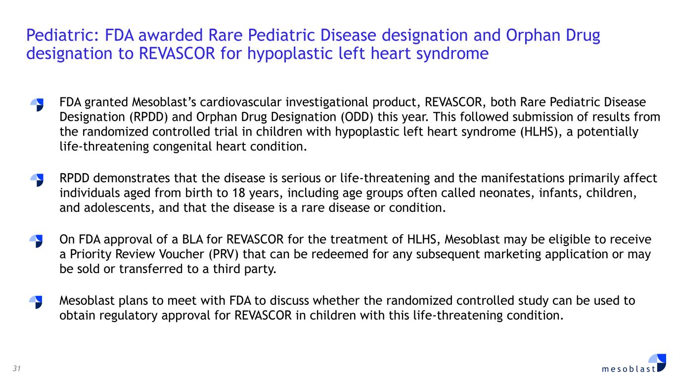 31 m e s o b l a s t FDA今年批准了Mesoblast的心血管研究产品REVASCOR,包括罕见儿科疾病指定(RPDD)和孤儿药指定(ODD)。在此之前,提交了儿童左心发育不全综合征(HLHS)的随机对照试验结果,这是一种可能危及生命的先天性心脏病。RPDD表明,这种疾病是严重的或危及生命的,表现主要影响从出生到18岁的个体,包括通常被称为新生儿、婴儿、儿童和青少年的年龄组,并且这种疾病是一种罕见的疾病或病症。在FDA批准用于治疗HLHS的REVASCOR的BLA后,Mesoblast可能有资格获得优先审查凭证(PRV),该凭证可用于赎回任何后续的上市申请,或可出售或转让给第三方。Mesoblast计划与FDA会面,讨论随机对照研究是否可用于获得监管机构批准REVASCOR用于患有这种危及生命的疾病的儿童。儿科:FDA授予REVASCOR治疗左心发育不全综合征的罕见儿科疾病认定和孤儿药认定