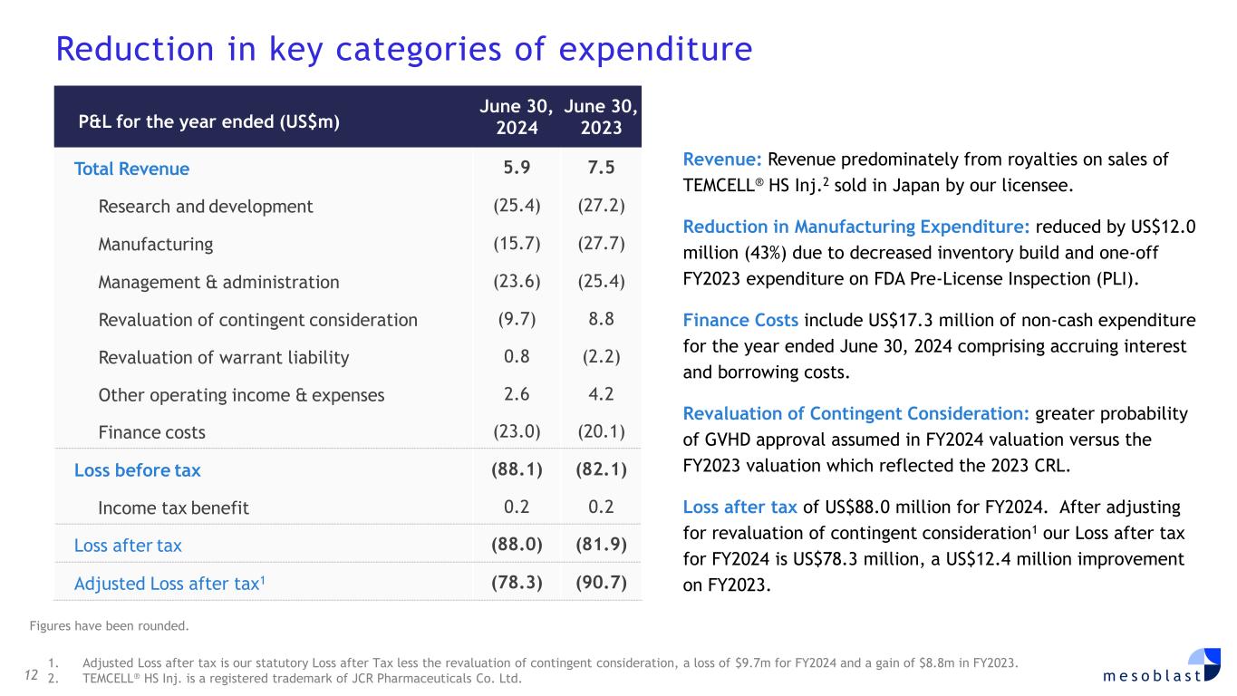 12 m e s o b l a s t关键类别支出减少收入:收入主要来自我们的被许可人在日本销售的TEMCELL ® HS Inj.2的销售特许权使用费。制造业支出减少:减少1,200万美元(43%),原因是库存增加减少以及FDA许可前检查(PLI)的一次性2023财年支出。财务成本包括截至2024年6月30日止年度的1730万美元非现金支出,包括应计利息和借款成本。或有对价的重估:在2024财年估值中假设的GVHD获批概率高于反映2023年CRL的2023财年估值。2024财年税后亏损8800万美元。经或有对价重估调整后1,我们2024财年税后亏损为7830万美元,较2023财年改善1240万美元。截至年度损益(百万美元)2024年6月30日2023年6月30日总收入5.9 7.5研发(25.4)(27.2)制造(15.7)(27.7)管理和行政(23.6)(25.4)或有对价重估(9.7)8.8认股权证负债重估0.8(2.2)其他营业收入和支出2.64.2财务成本(23.0)(20.1)税前亏损(88.1)(82.1)所得税收益0.2 0.2税后亏损(88.0)(81.9)调整后税后亏损1(78.3)(90.7)数字已四舍五入。1.调整后的税后亏损是我们的法定税后亏损减去或有对价重估,2024财年亏损970万美元,2023财年收益880万美元。2.TEMCell ® HS Inj.is JCR Pharmaceuticals Co. Ltd.的注册商标。