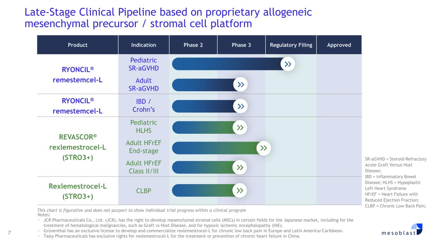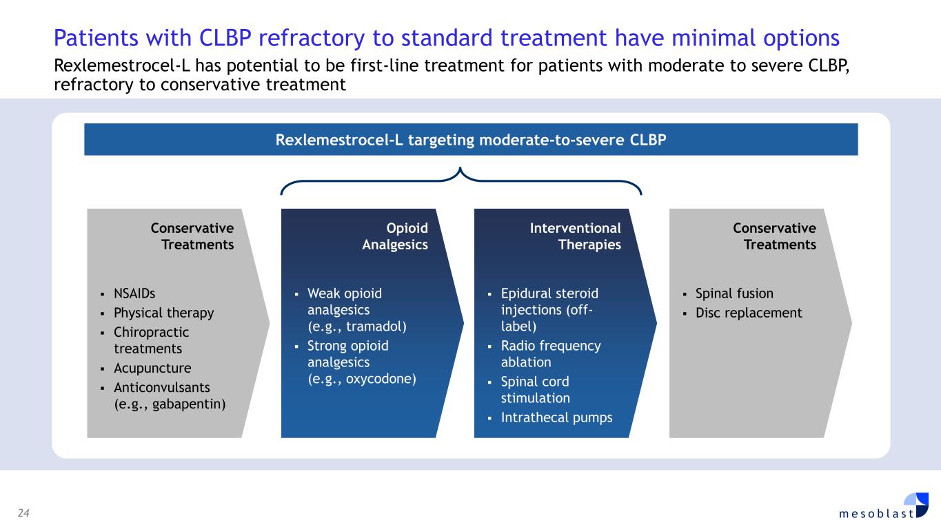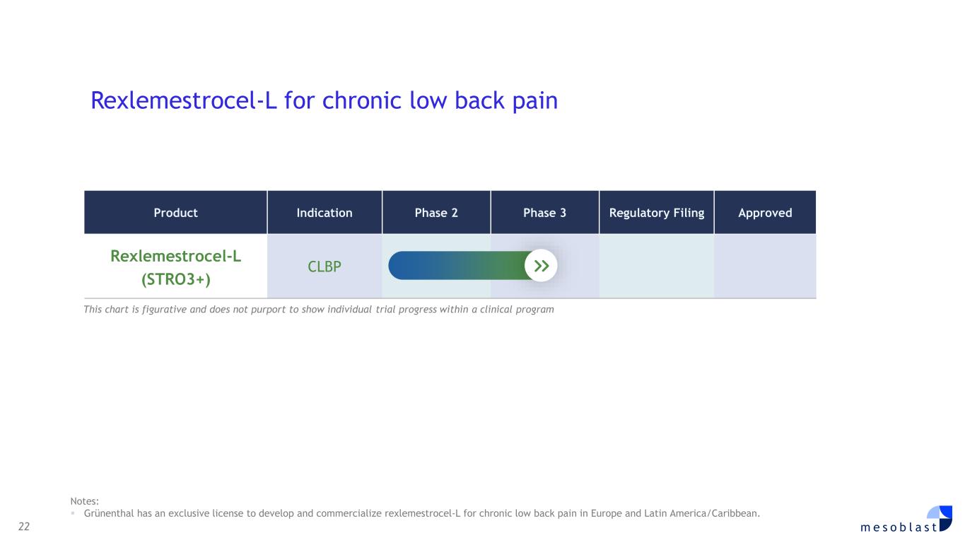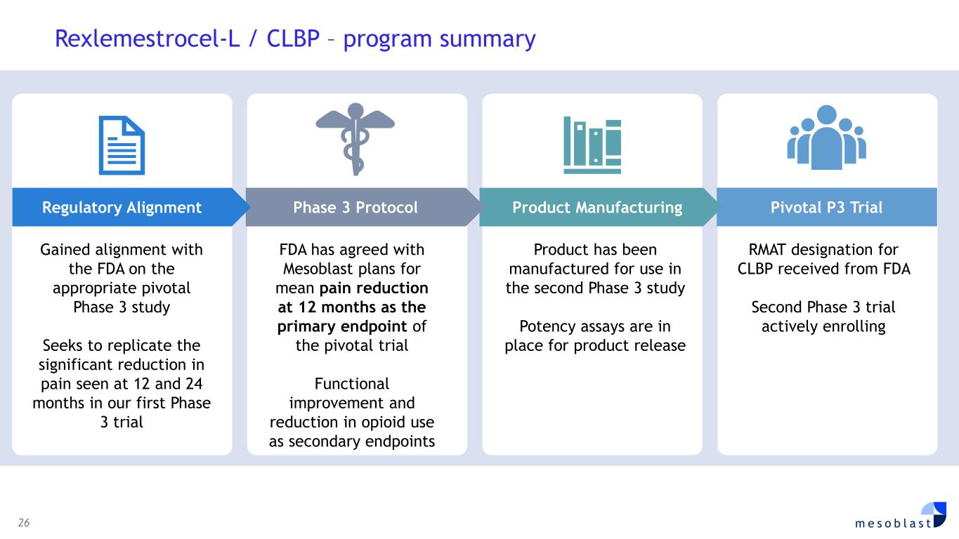 26m e s o b l a s t Rexlemestrocel-L/CLBP –项目摘要在适当的关键3期研究上与FDA取得一致寻求复制在我们的第一个3期试验中12个月和24个月时看到的疼痛的显着减少FDA已同意将12个月时的平均疼痛减轻作为关键试验功能改善的主要终点的中间成细胞计划并减少阿片类药物的使用作为次要终点产品已制造用于第二个3期研究效力测定已到位用于CLBP的产品释放RMAT指定收到FDA第二个3期试验积极招募Pivotal P3试验产品制造3期协议监管对齐